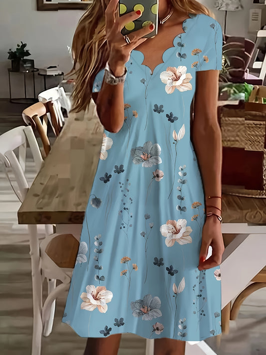 Floral Print Scallop Trim Dress, Vintage V-neck Short Sleeve Dress For Spring & Summer, Women's Clothing