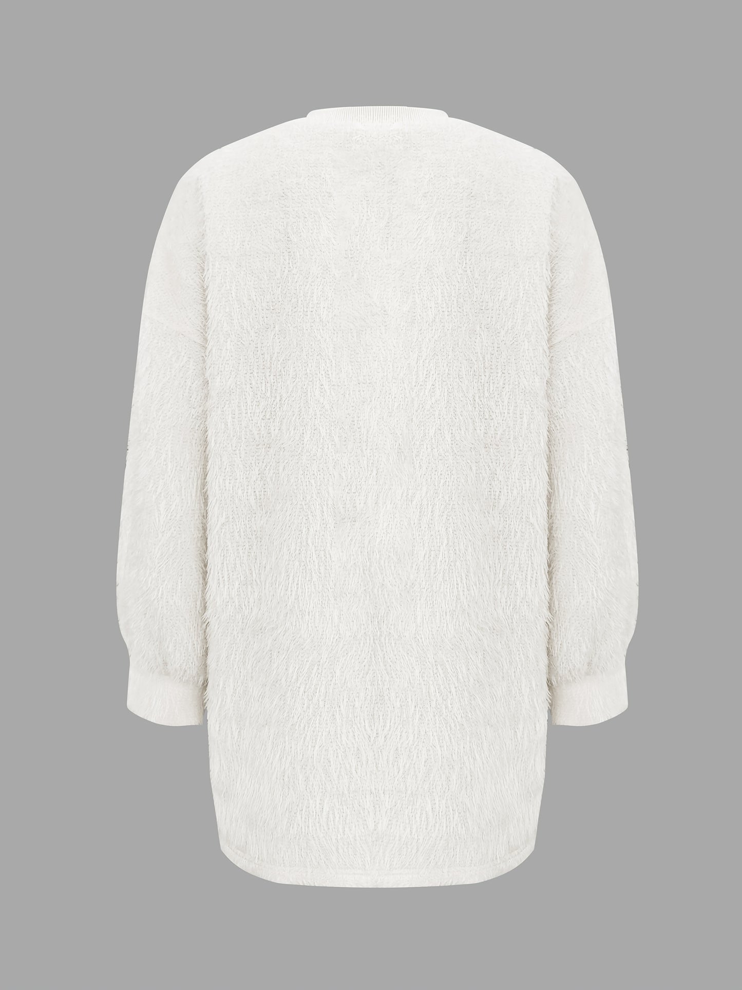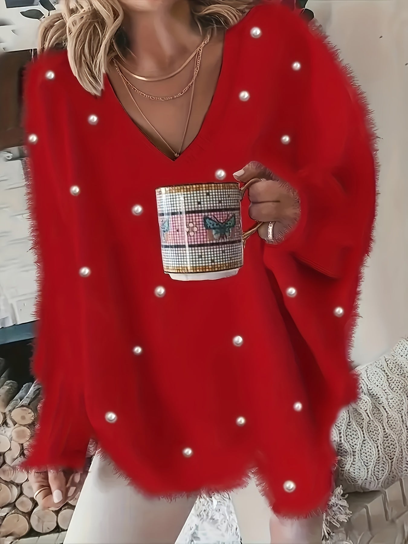 Beaded V-Neck Sweater, Casual Loose Fit, Long Sleeve, Cream Knit.