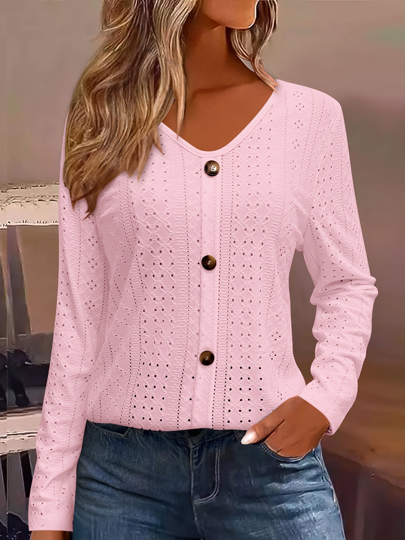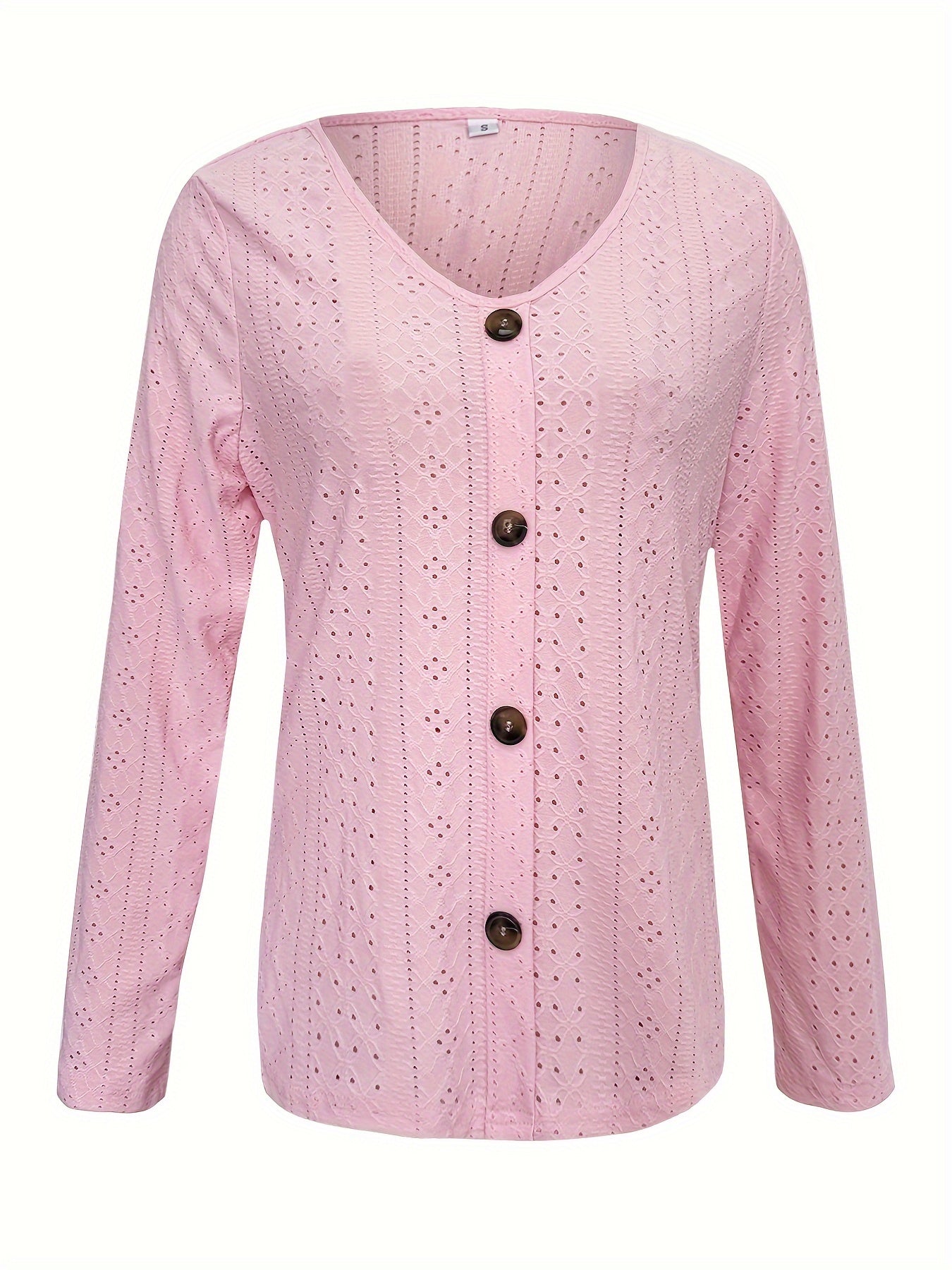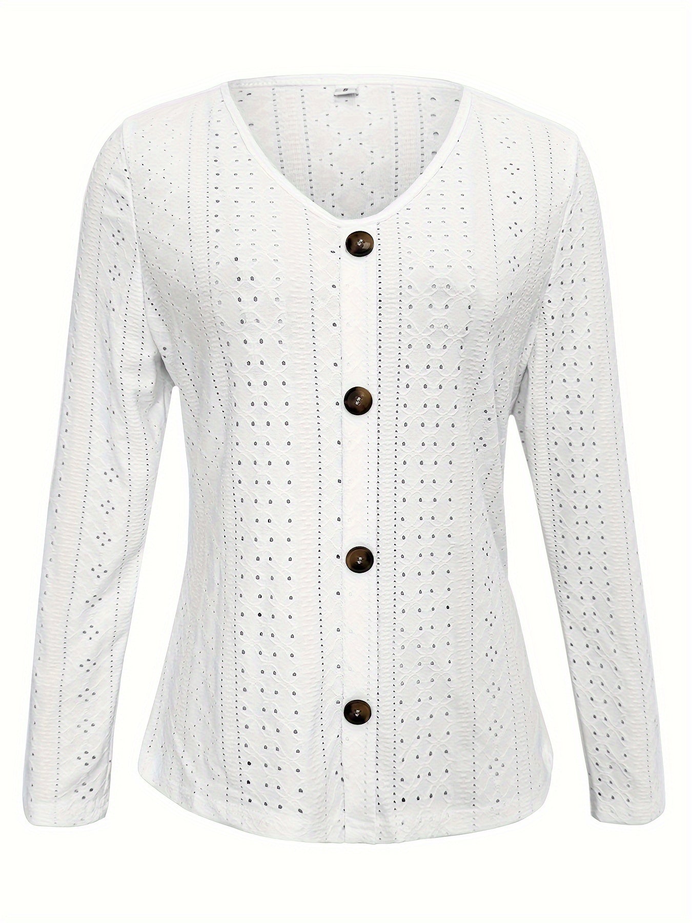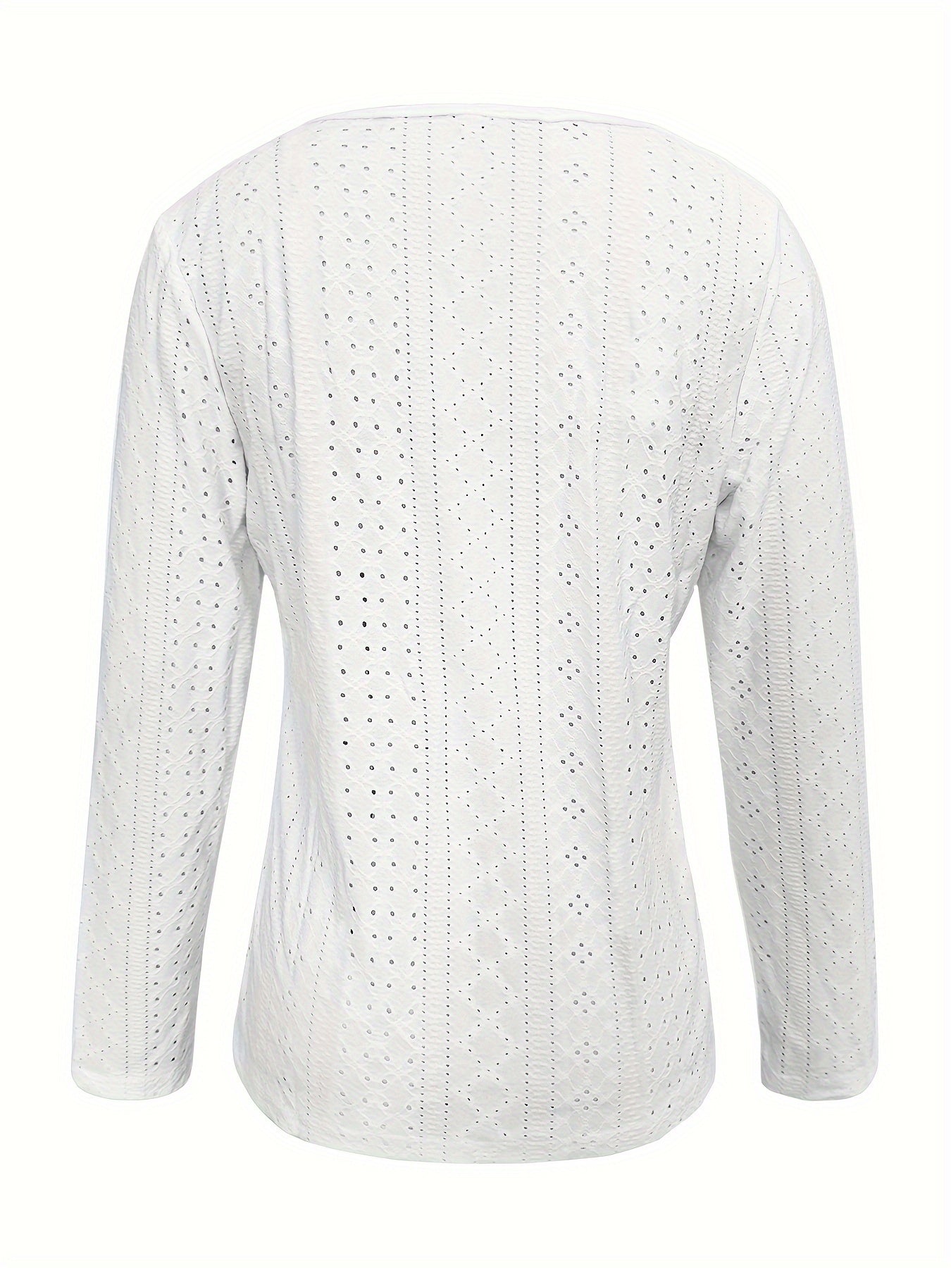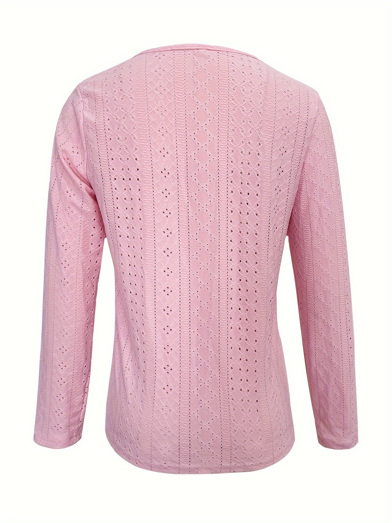 Eyelet Button Front T-Shirt, Casual V-Neck, Long Sleeve for Spring & Fall.