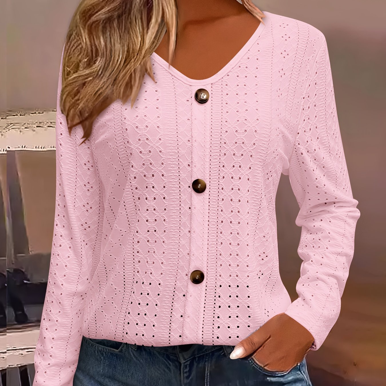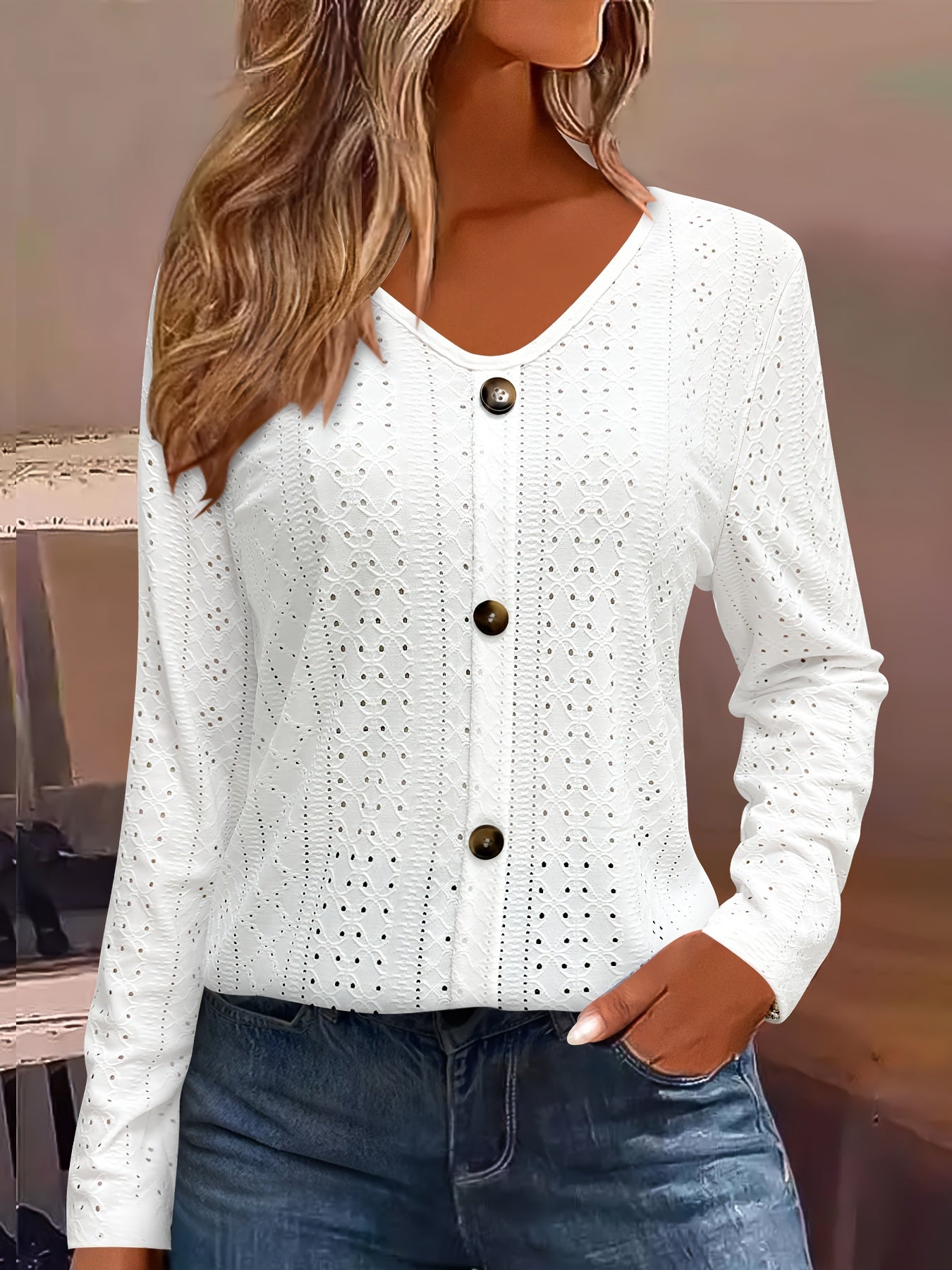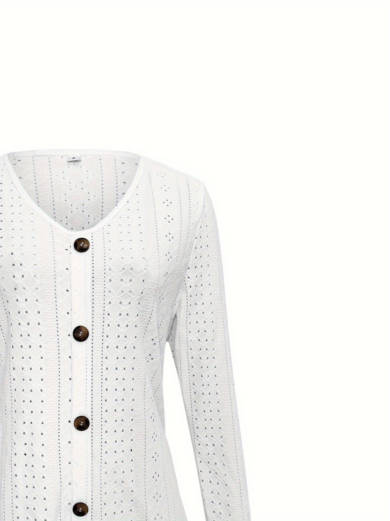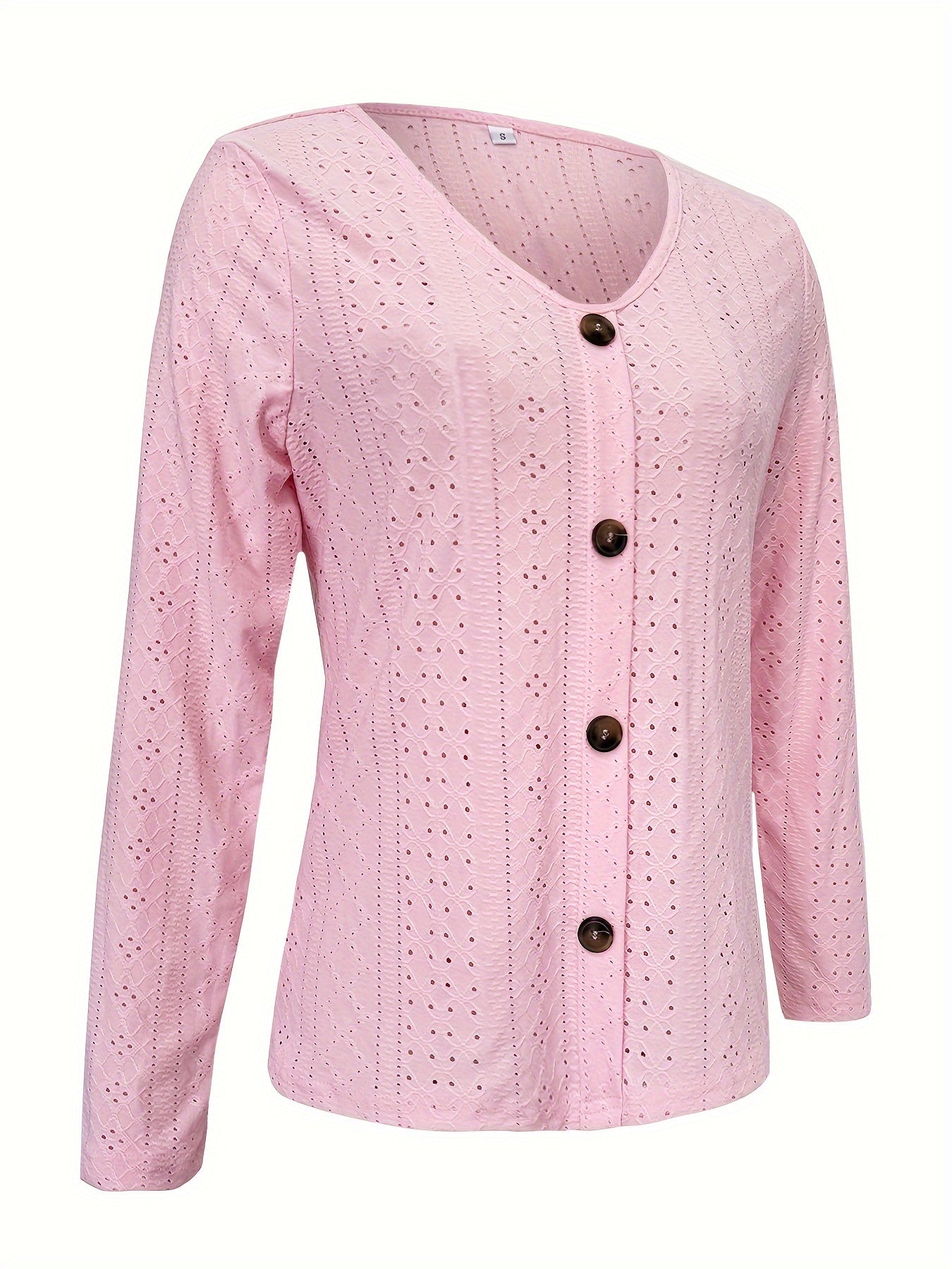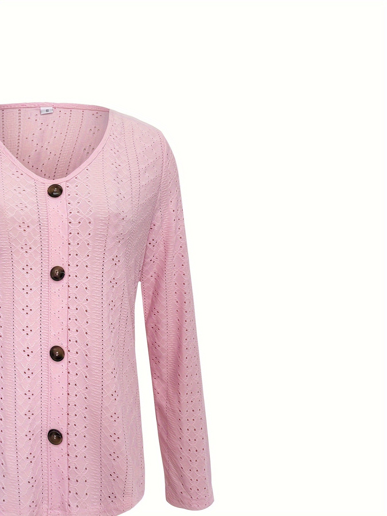 Eyelet Button Front T-Shirt, Casual V-Neck, Long Sleeve for Spring & Fall.