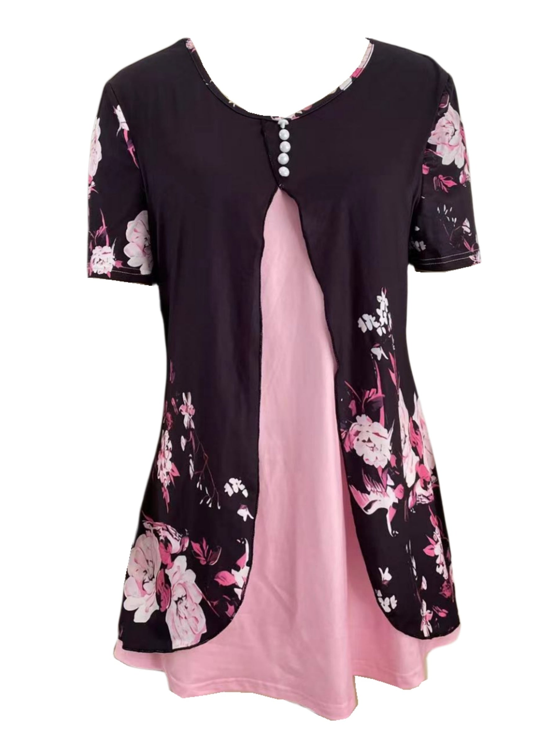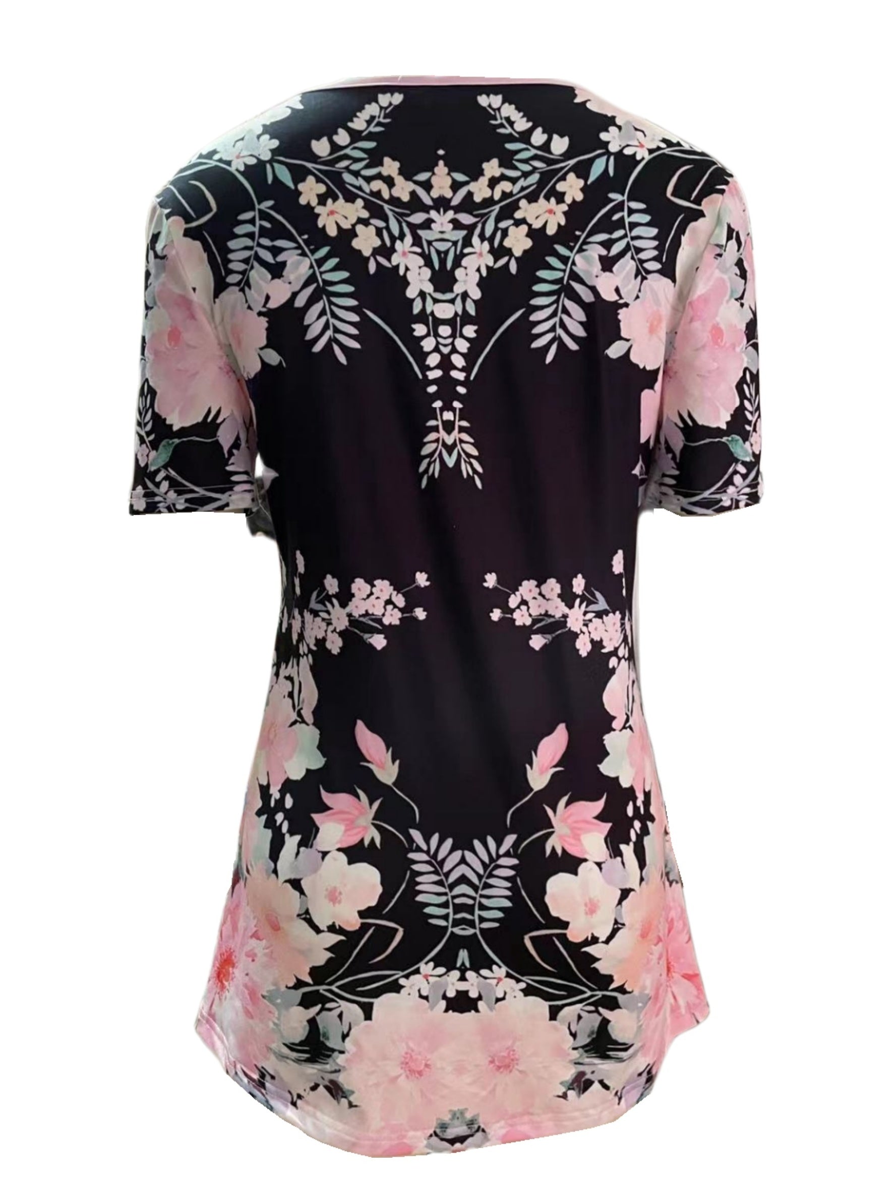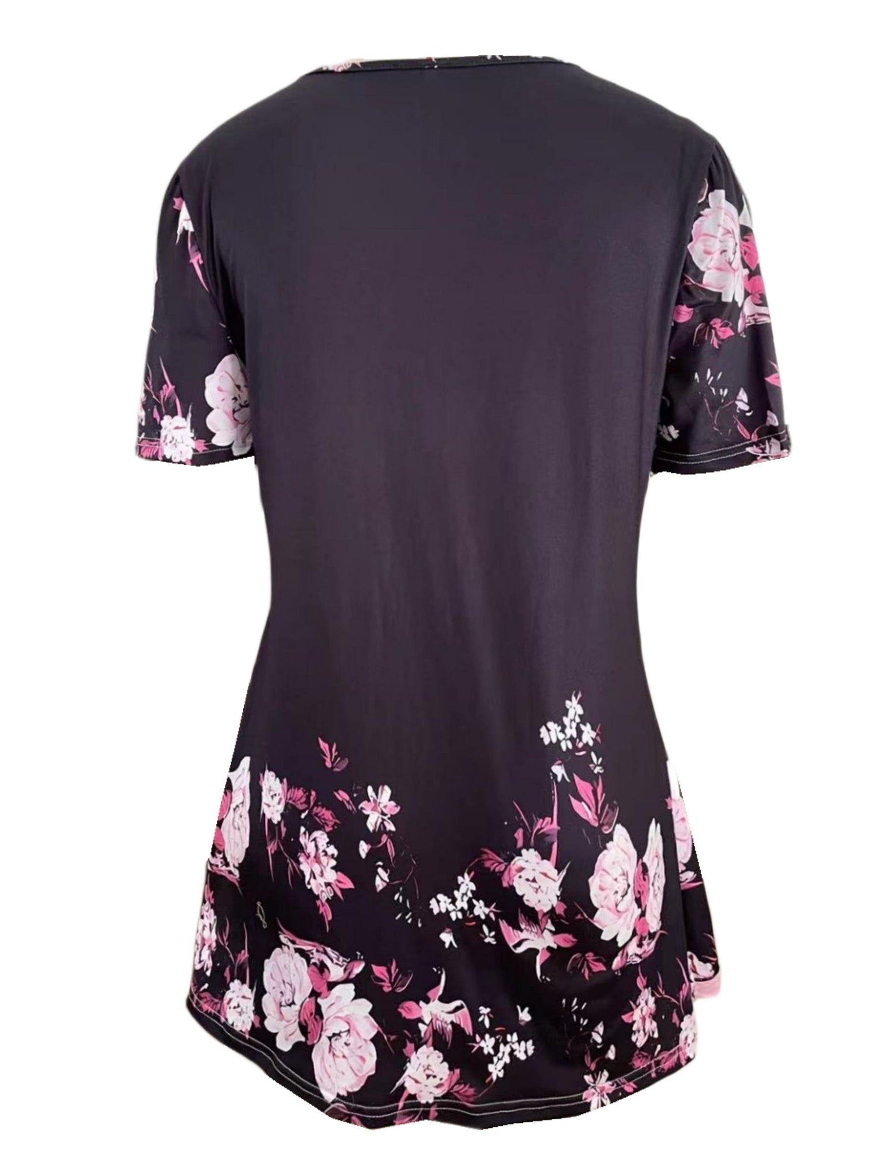 Charming Floral Print T-Shirt with Glamorous Faux Pearl Accents - Comfortable V Neck Short Sleeve Top - Ideal Casual Wear for Spring & Summer - Womens Fashion Essential