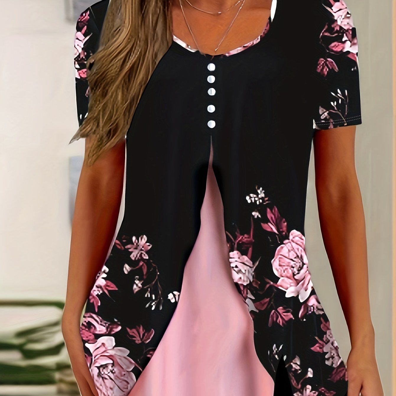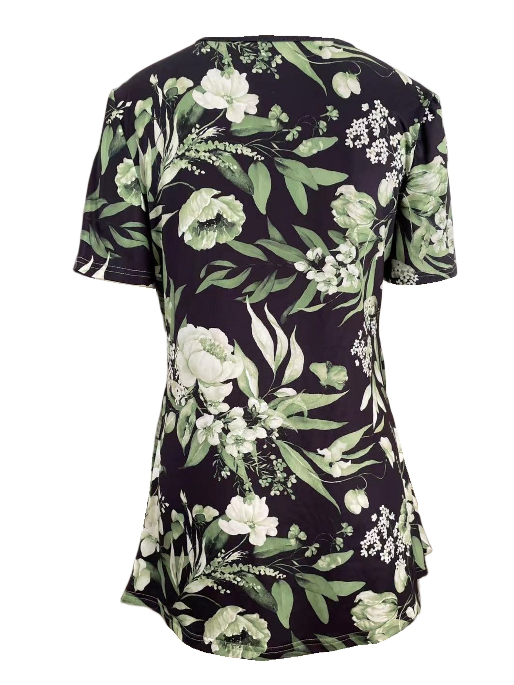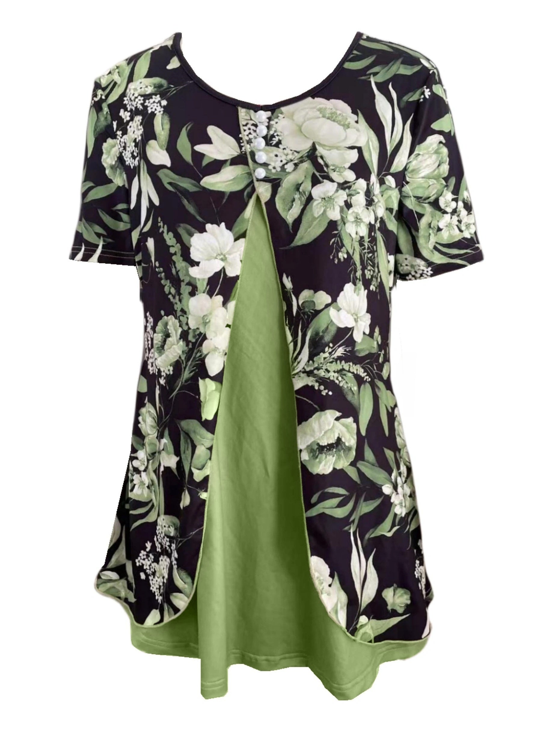 Charming Floral Print T-Shirt with Glamorous Faux Pearl Accents - Comfortable V Neck Short Sleeve Top - Ideal Casual Wear for Spring & Summer - Womens Fashion Essential