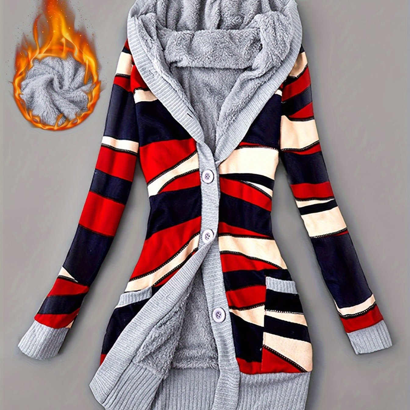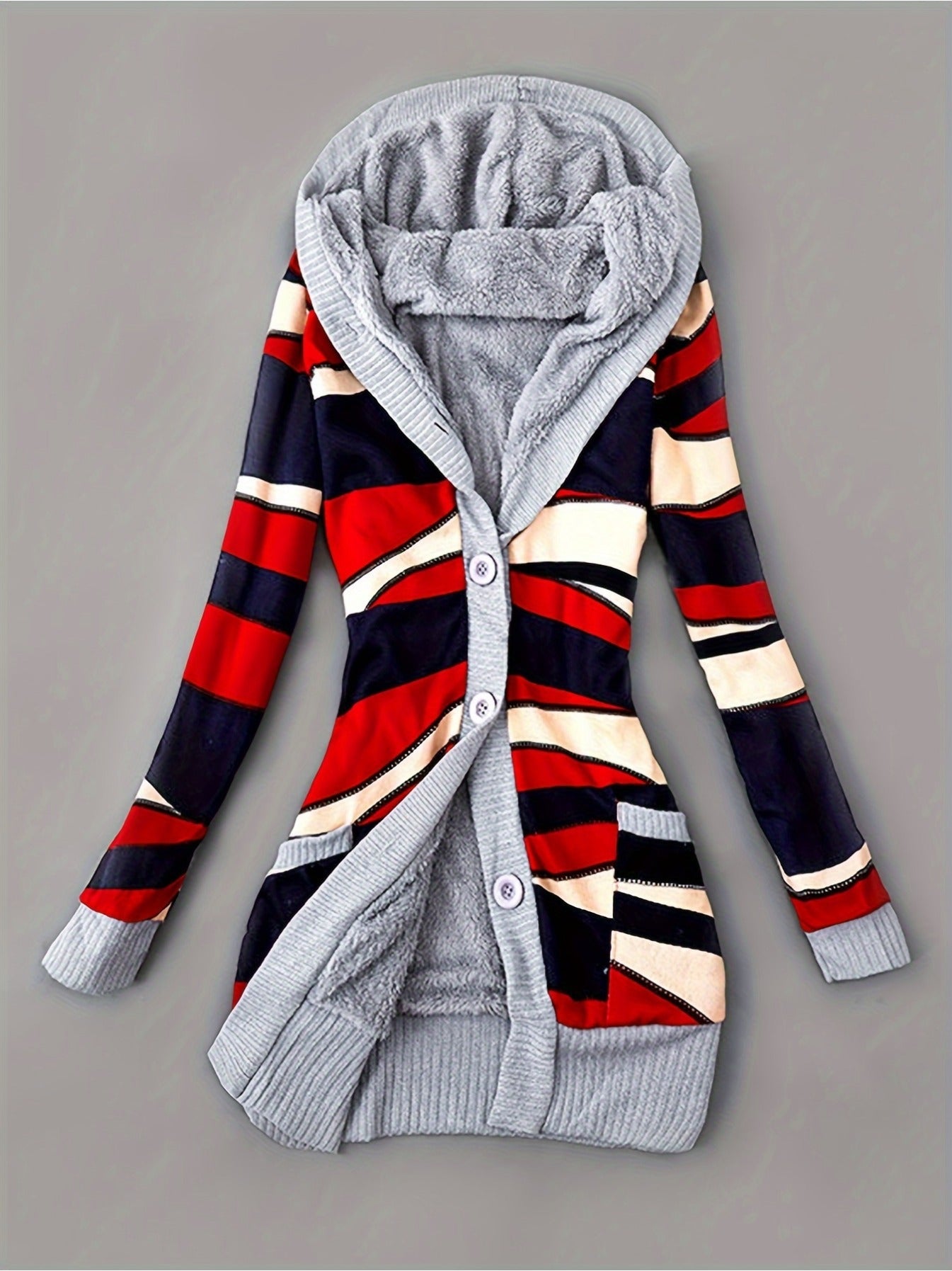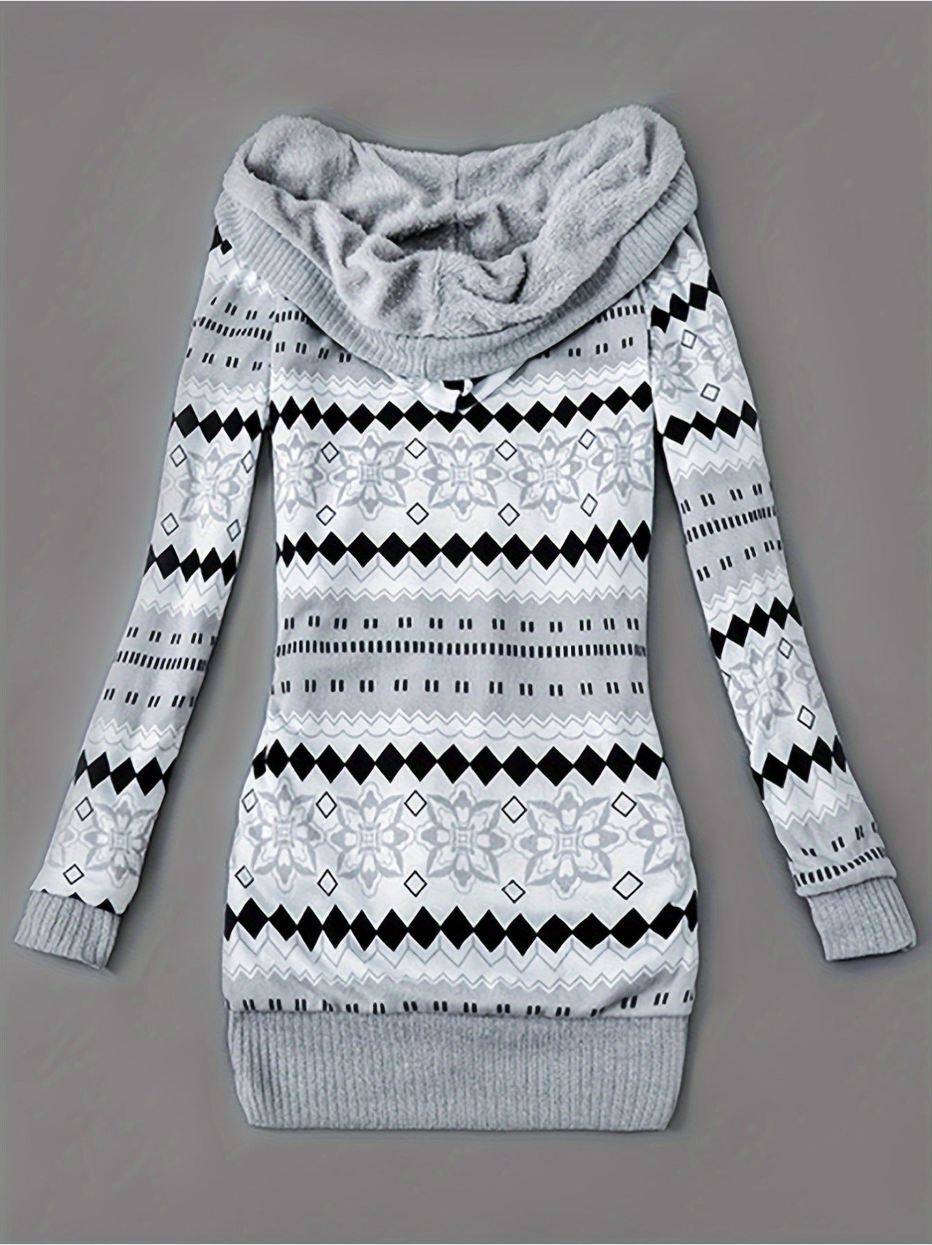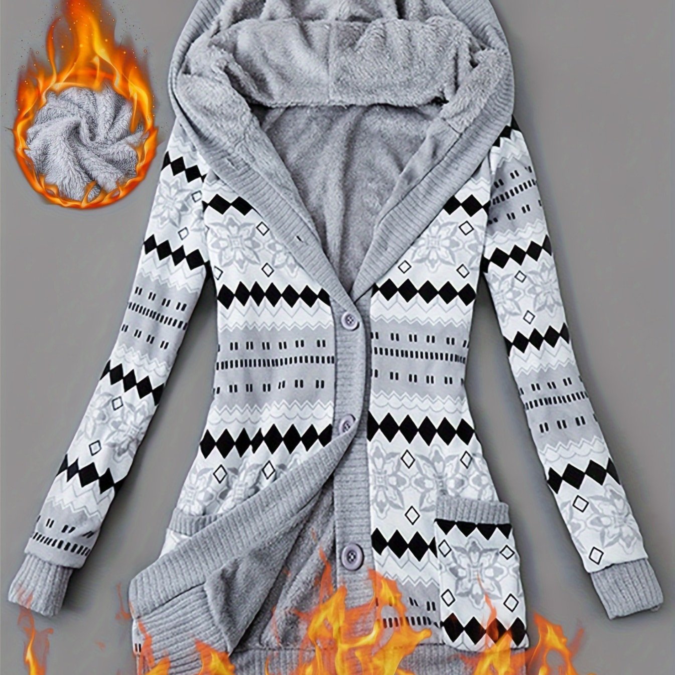 Geometric Print Fleece Lined Hoodie Jacket for Women, Casual Mid-Length