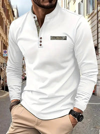 Men's Casual Henley Shirt - Stand Collar, Long Sleeve, Button Detail, Stretch Fabric