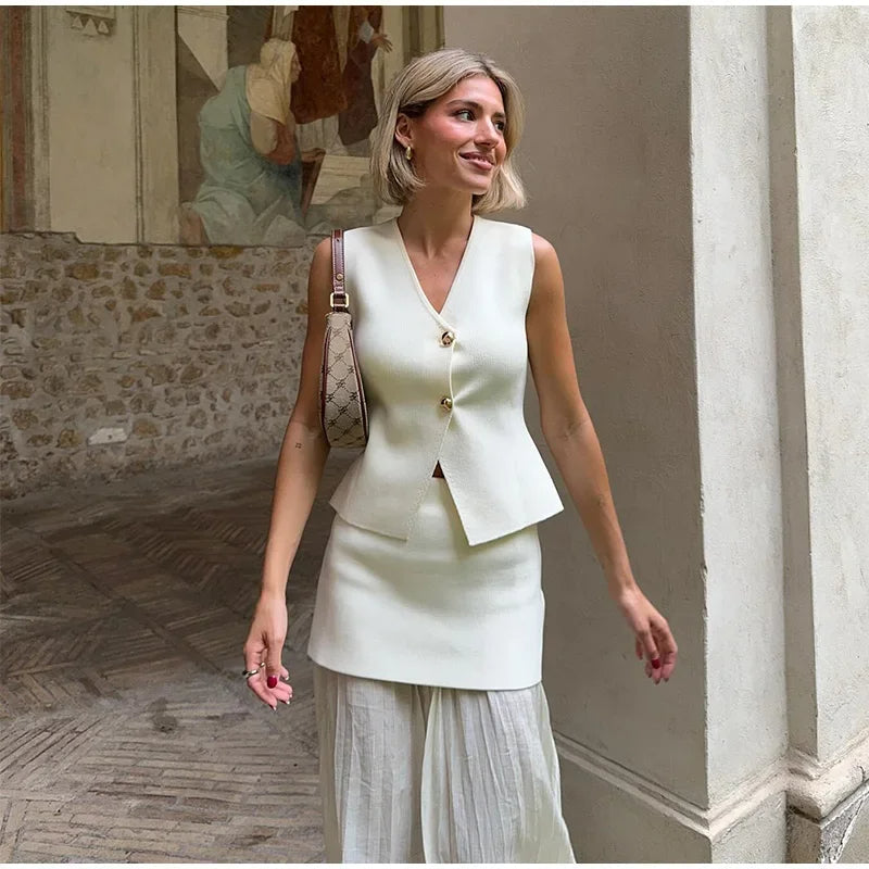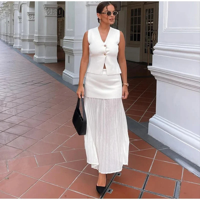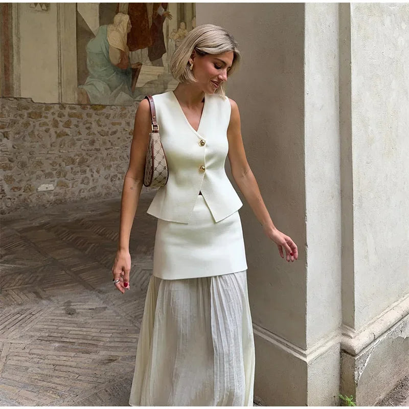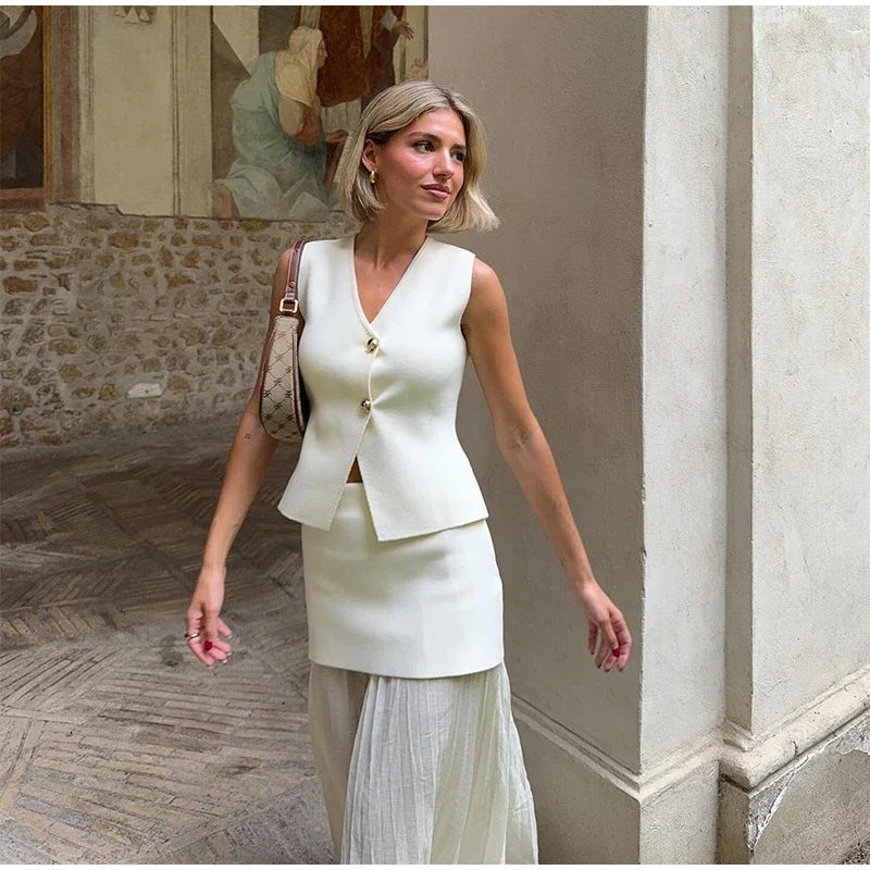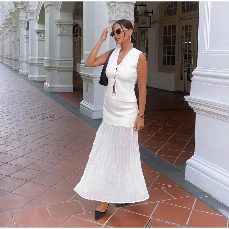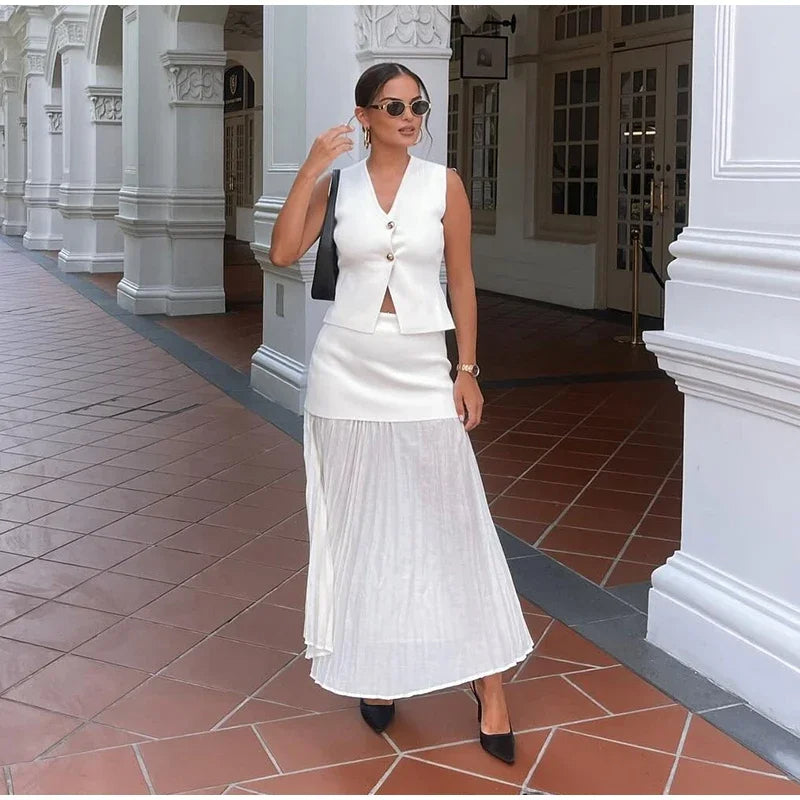 Indulge in the timeless charm of the Peyton™ 2-Piece Knitted Set. Designed for effortless elegance. this summer-ready ensemble features a structured V-neck vest top that pairs beautifully with a flowing ankle-length skirt. creating a look that's both sophisticated and relaxed. The premium knitted fabric offers a luxurious feel. ensuring comfort without compromising on style. Perfect for any occasion. from casual outings to more formal events. this versatile set adds a touch of refinement to your wardrobe. Elevate your fashion game with the Peyton™ Set—where comfort meets timeless beauty.