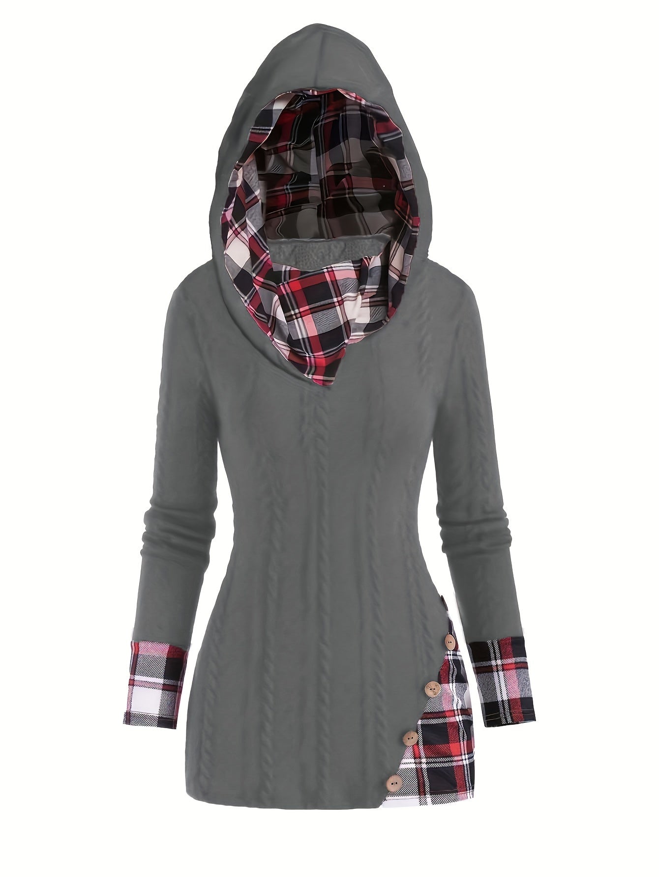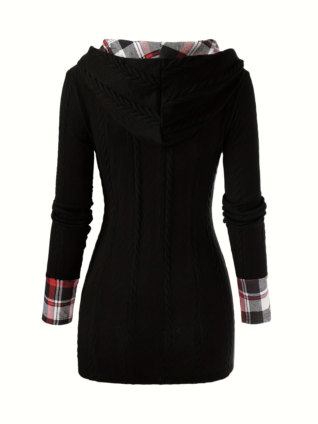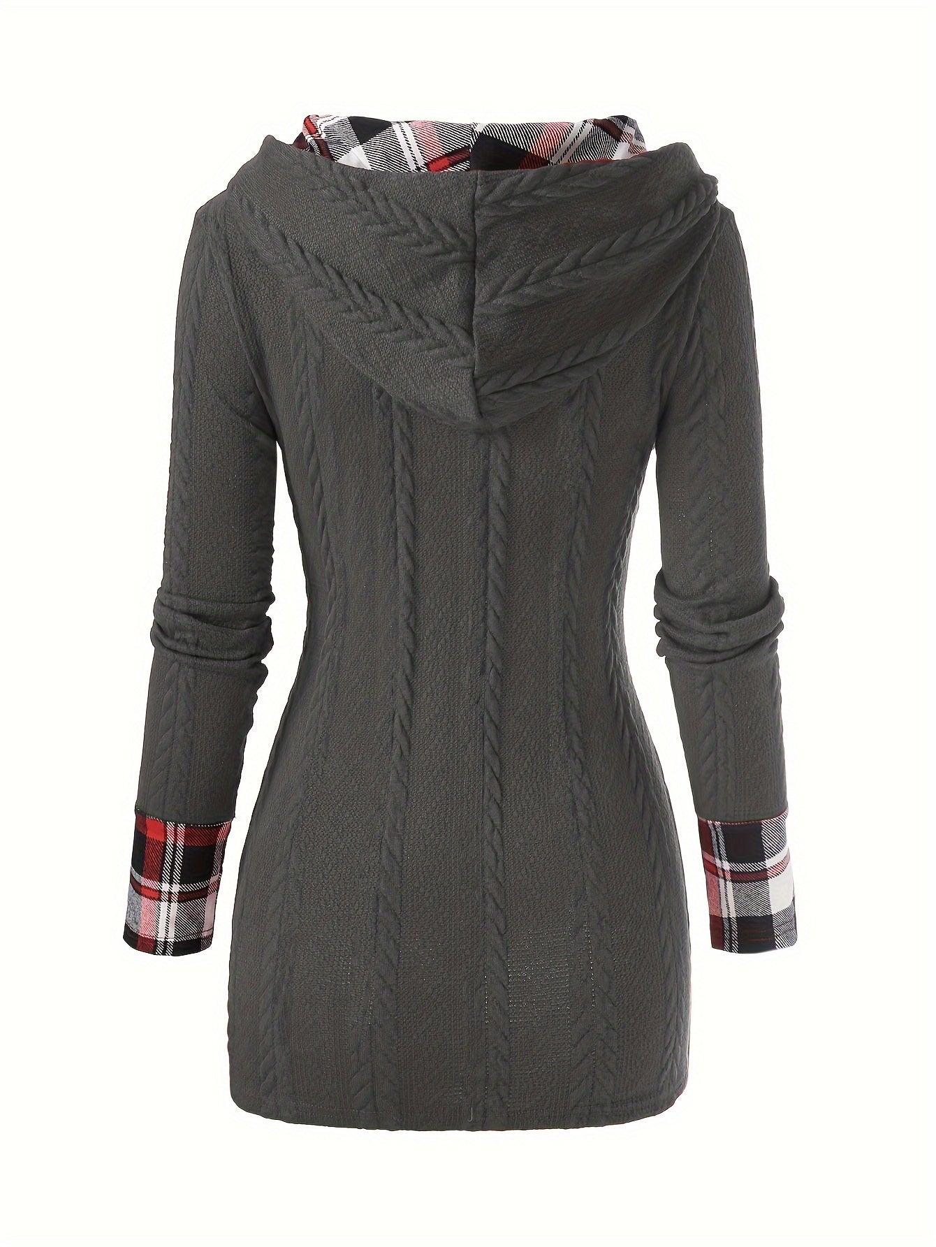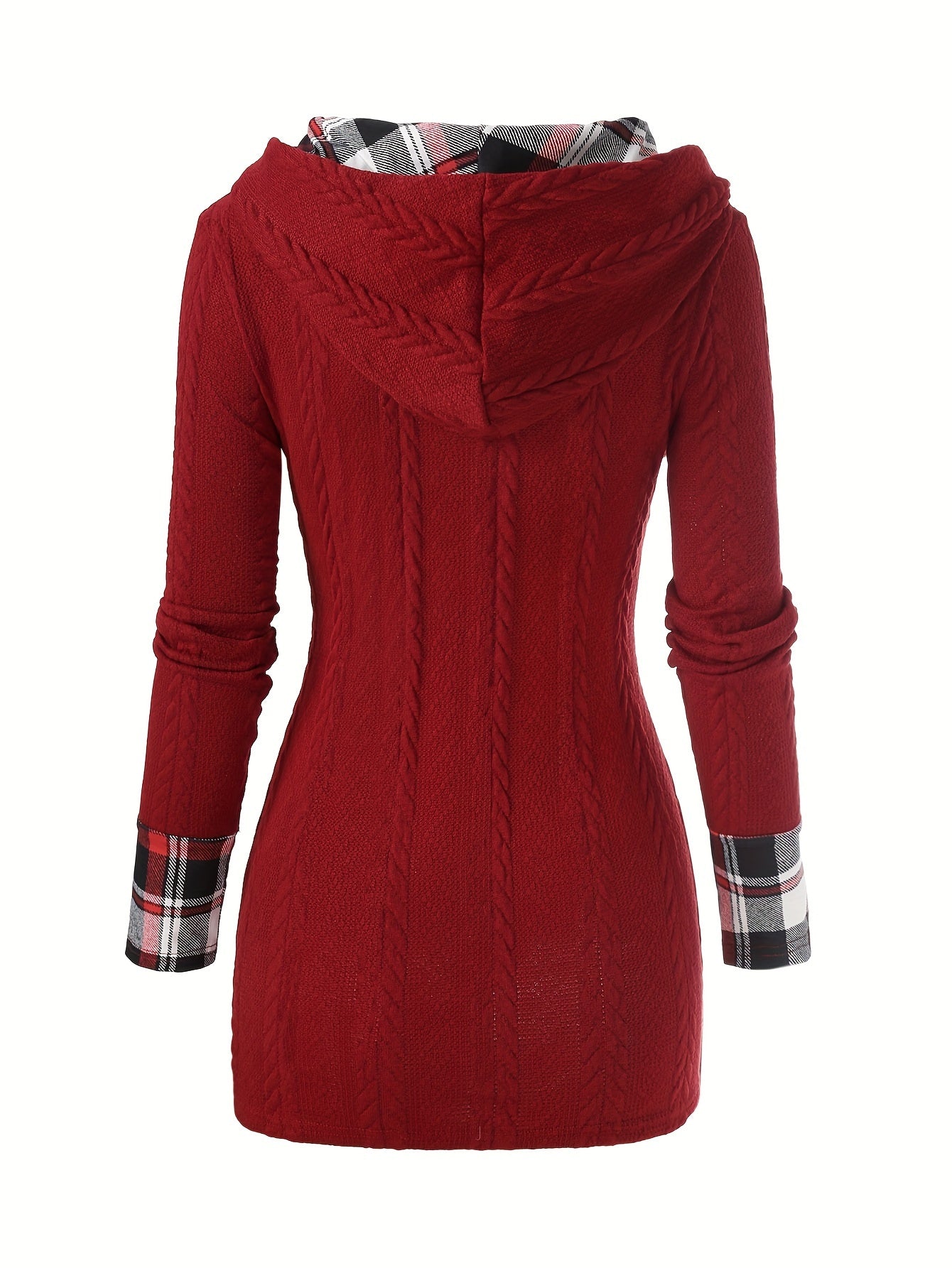 Plaid Cable Knit Hooded Sweater, Button Detail, Casual Long Sleeve