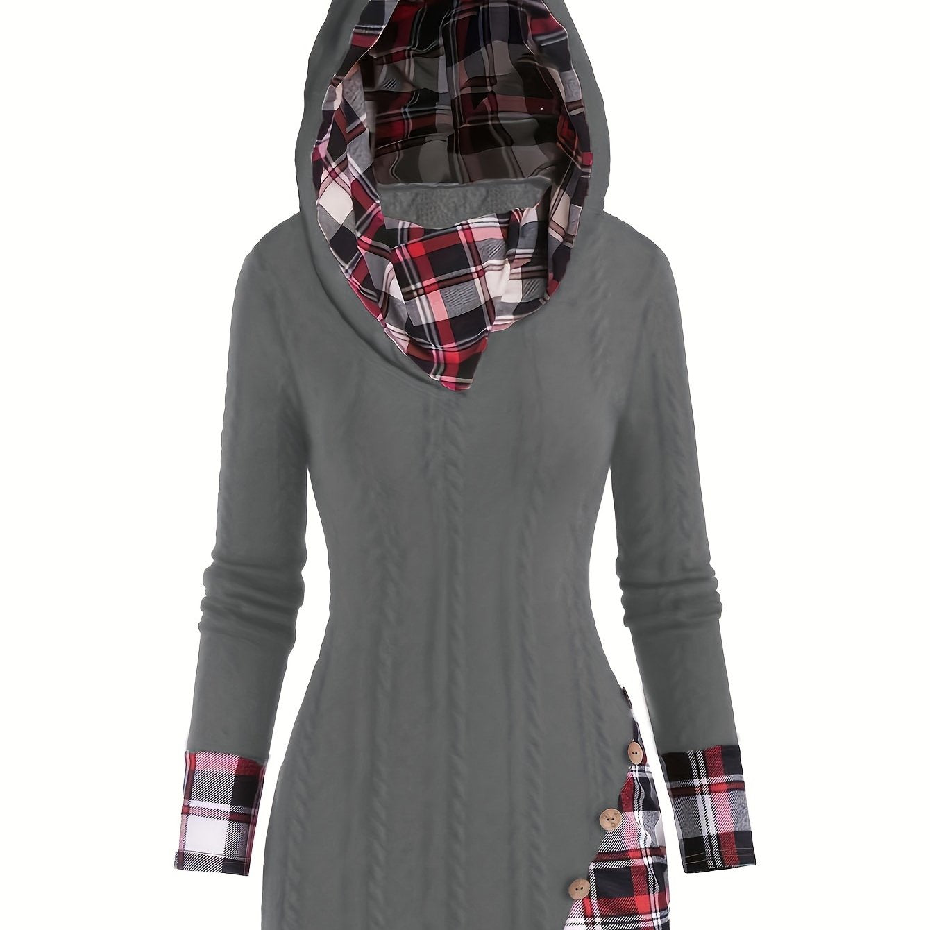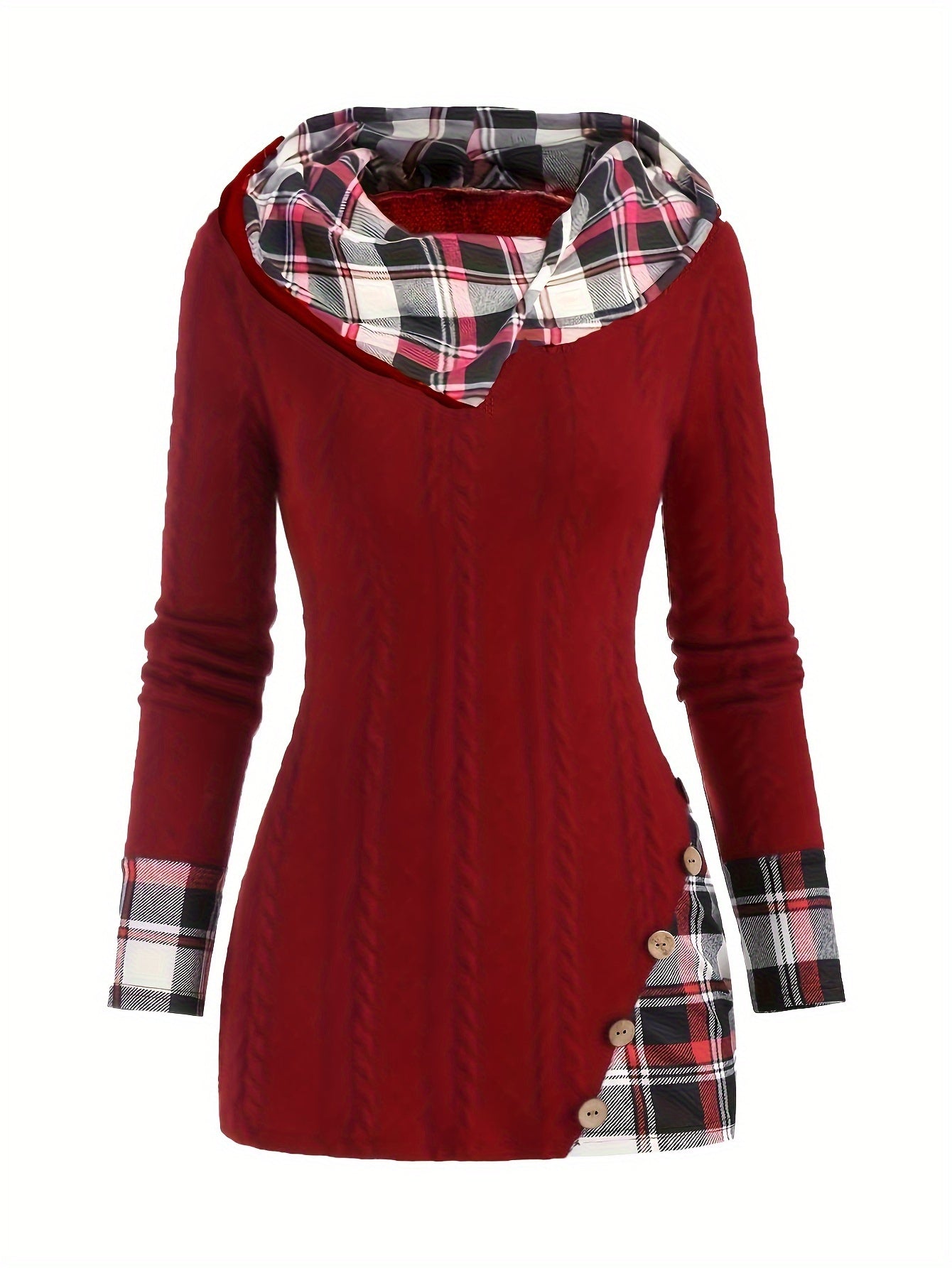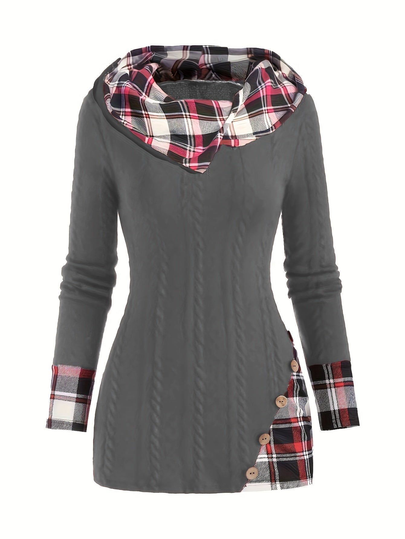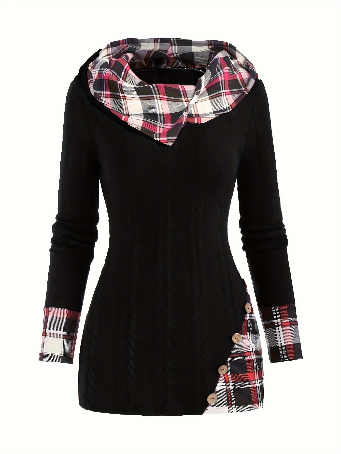 Plaid Cable Knit Hooded Sweater, Button Detail, Casual Long Sleeve