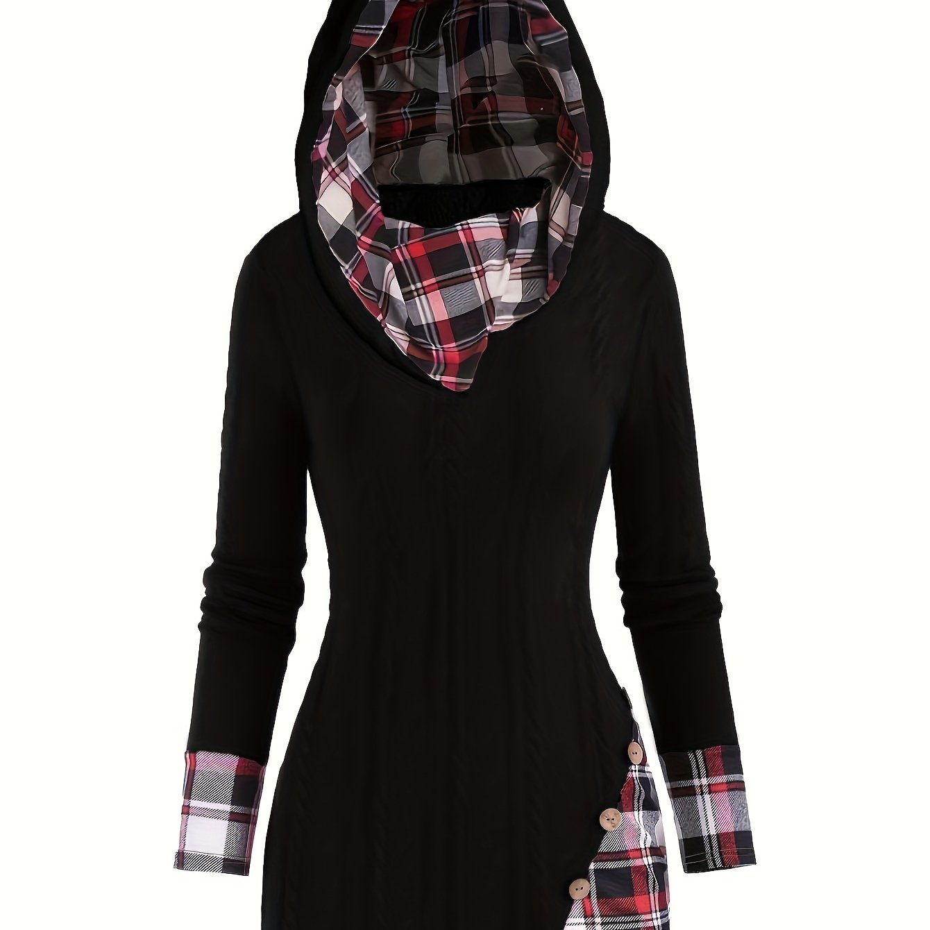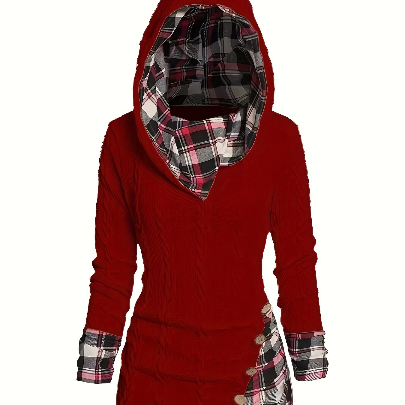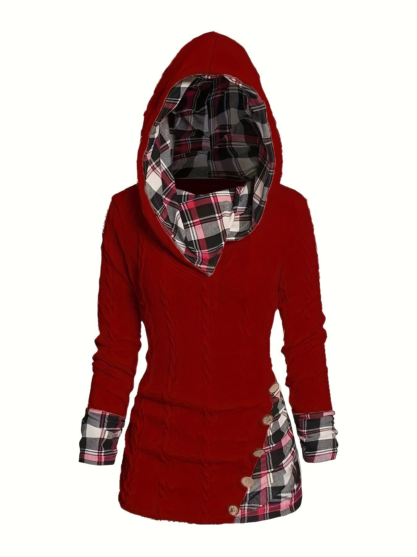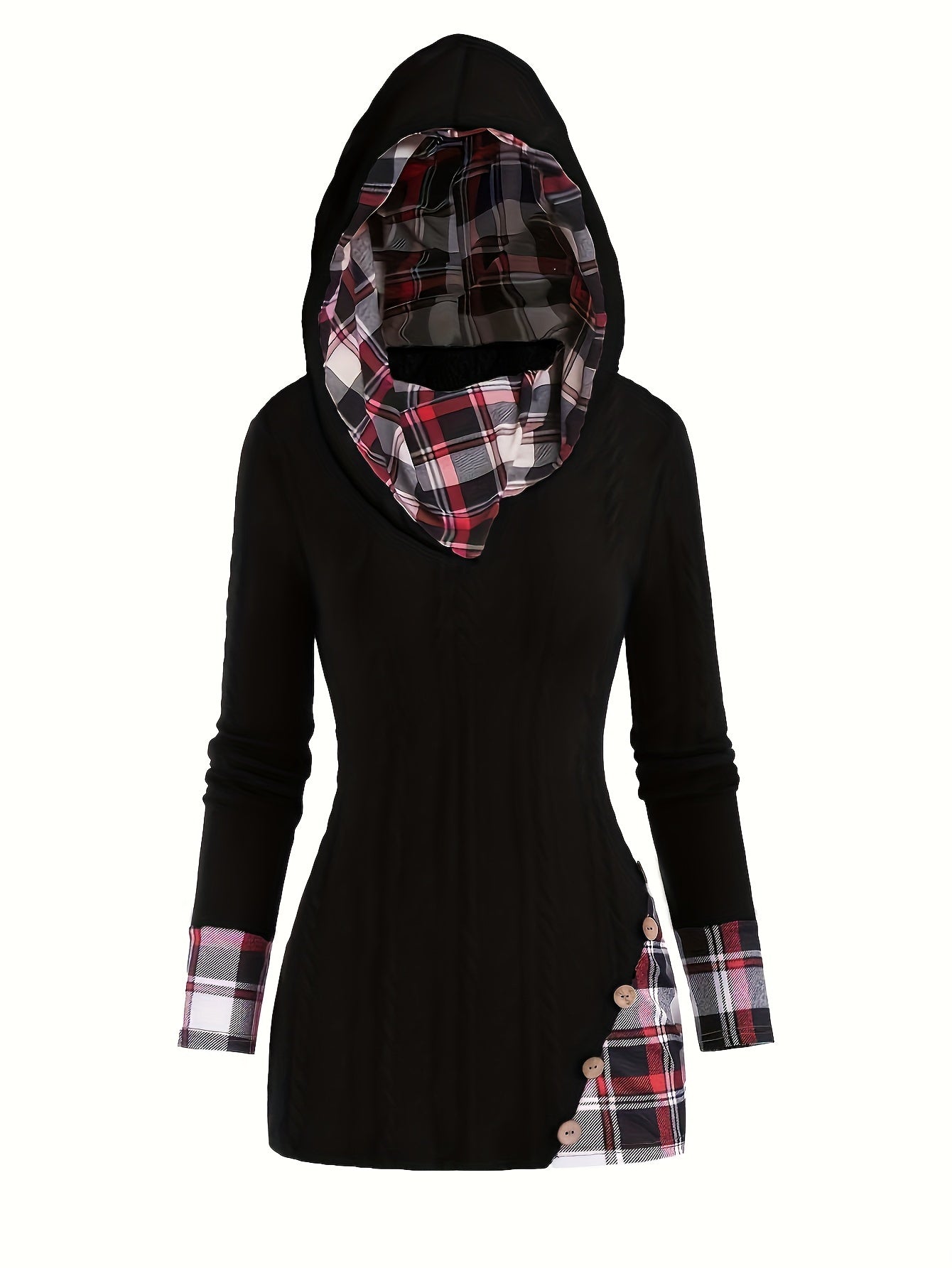 Plaid Cable Knit Hooded Sweater, Button Detail, Casual Long Sleeve