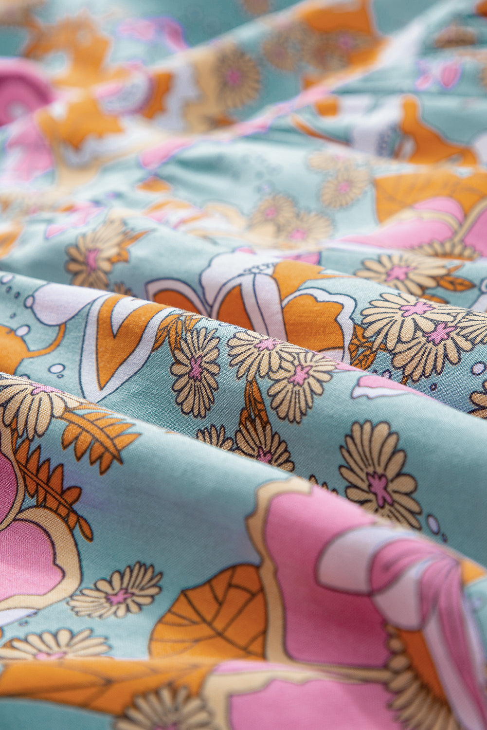 This floral dress features a smocked bodice. high waist and puff sleeves. The smocked bodice offers flexibility and comfort. while the high waist creates a flattering silhouette. The puff sleeves add a touch of femininity and playfulness to this versatile dress.