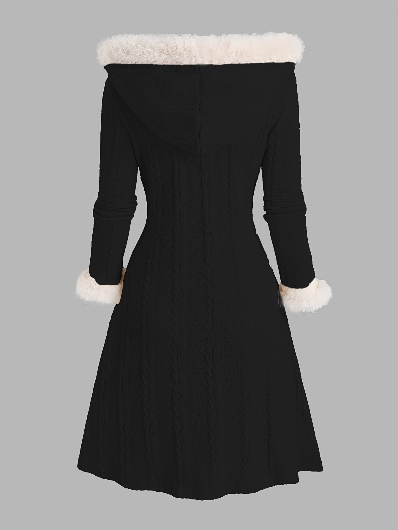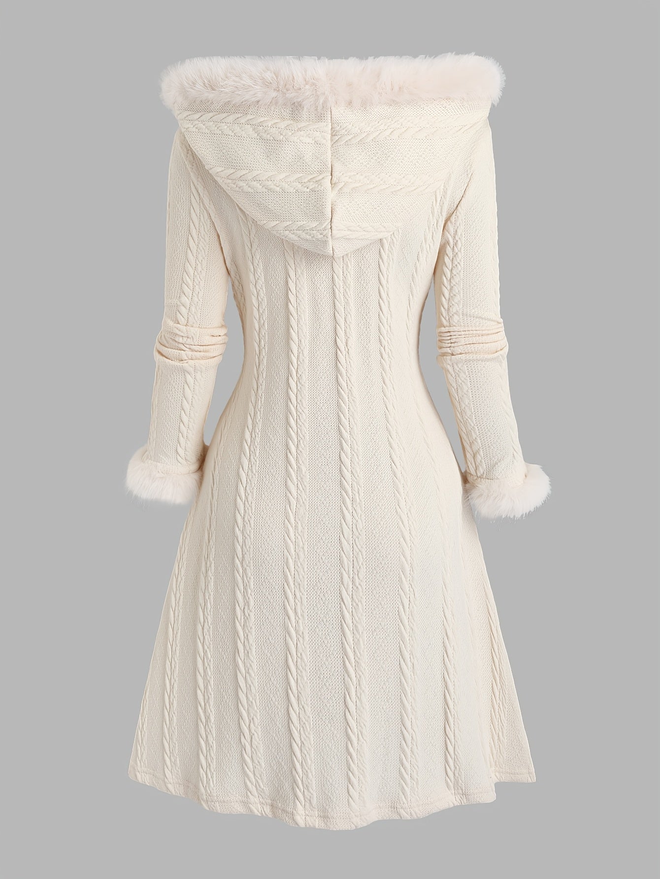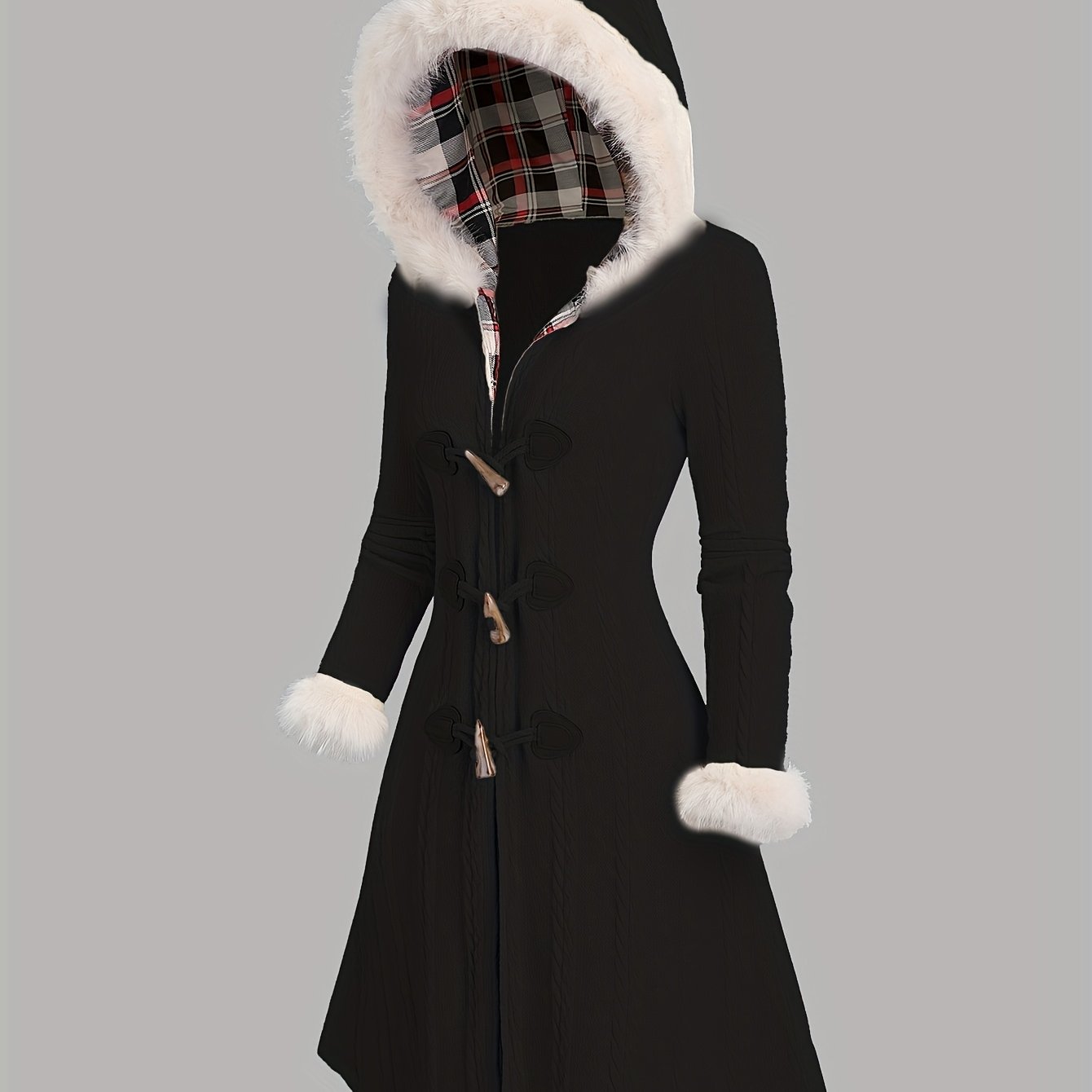 Y2K Plaid Hooded Knit Coat with Faux Fur Trim, Horn Buttons, Long & Warm