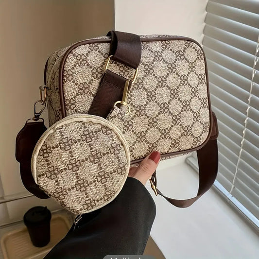 Bolsa tiracolo com zíper e estampa gráfica - estilosa, alça larga, grande capacidade