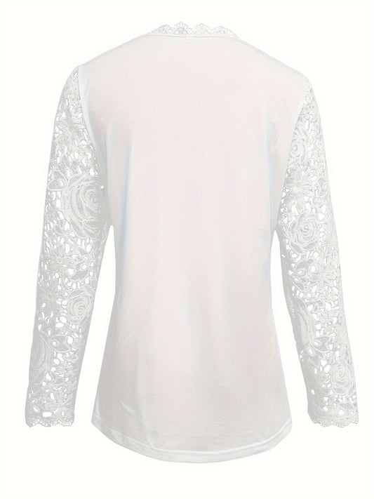 Camiseta com acabamento em vieira e renda guipura, manga longa elegante para primavera/outono.