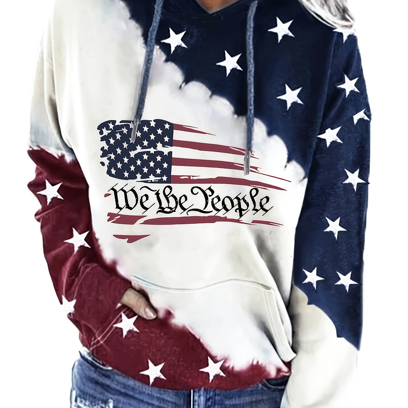 Moletom com capuz com estampa de bandeira americana e cordão, moletom casual de manga comprida com bolso canguru, roupas femininas