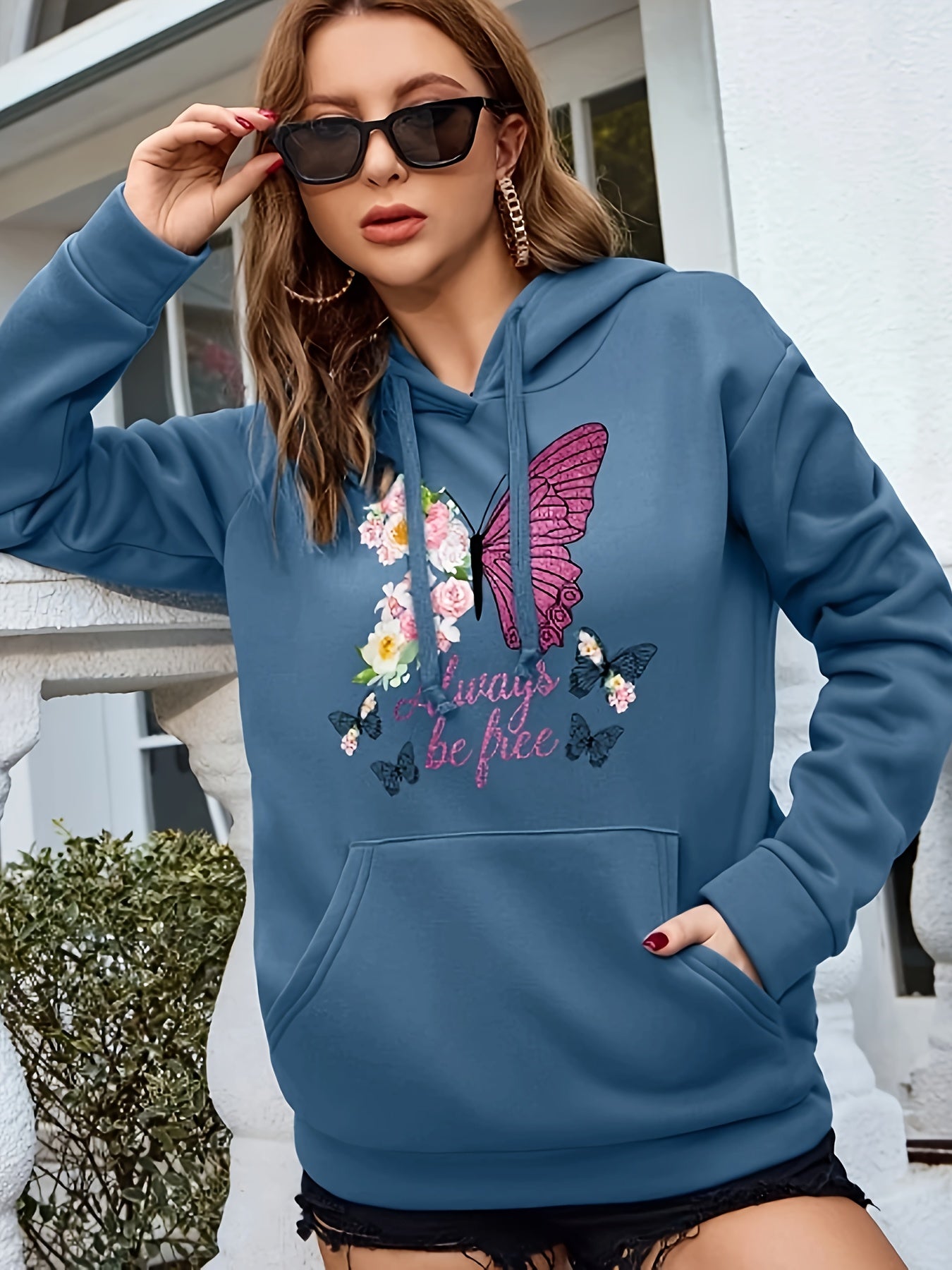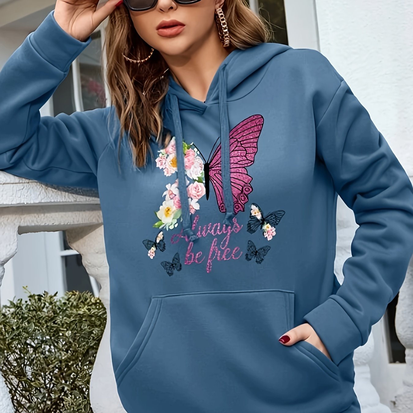 Moletom com capuz com estampa de borboleta e floral, moletom casual de manga comprida com bolso canguru, roupas femininas