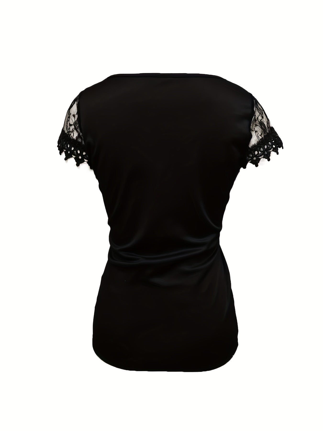 Camiseta de renda contrastante com gola quadrada e manga curta elegante para primavera e verão.