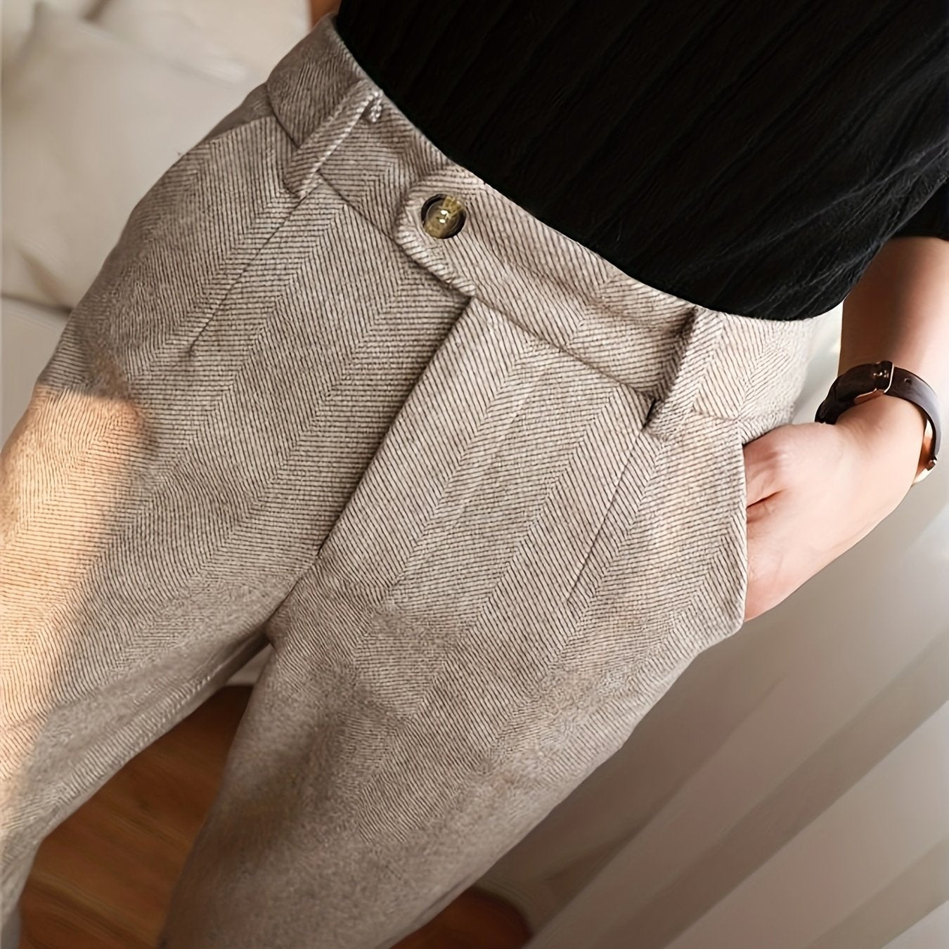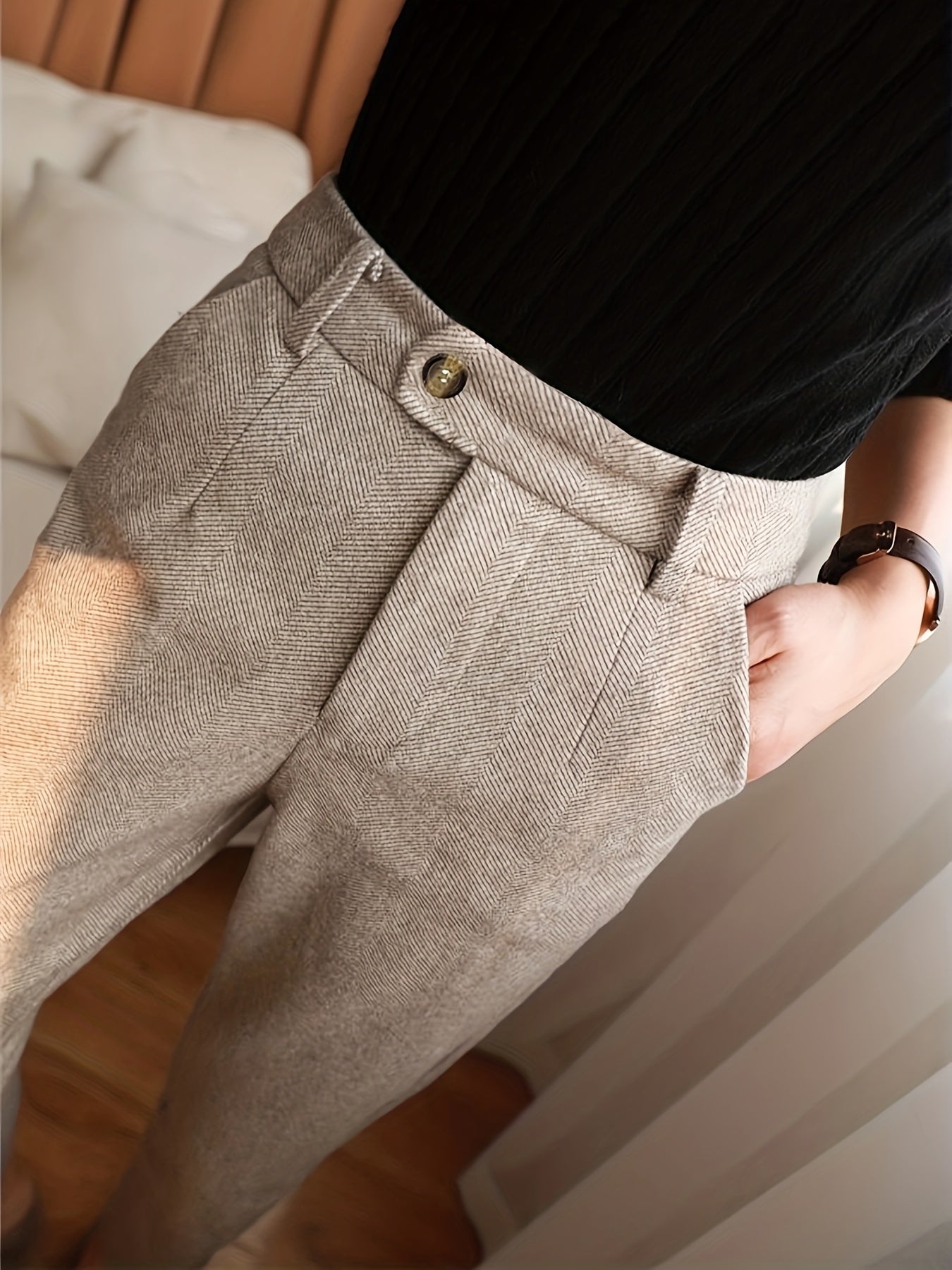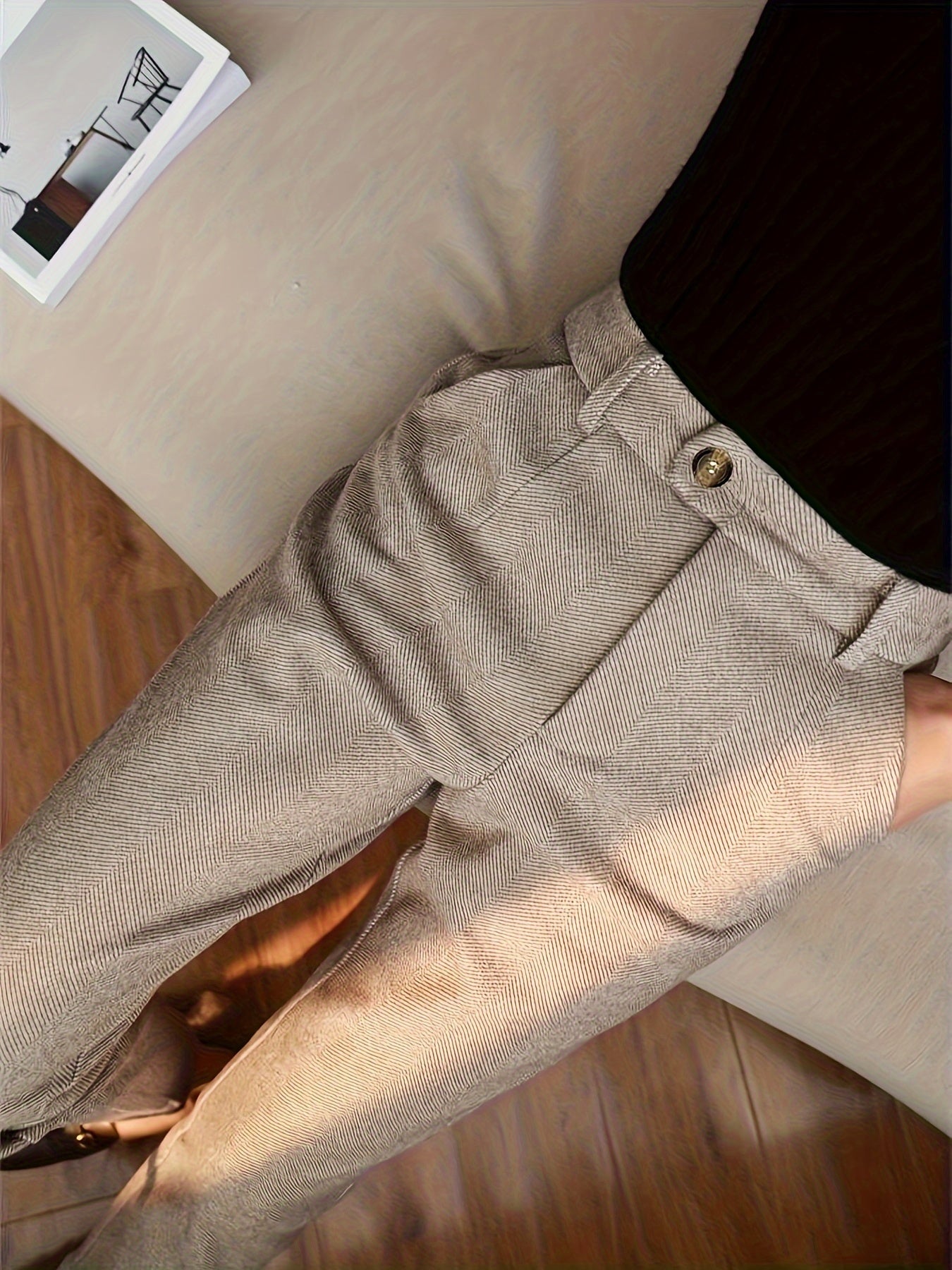Calça reta espinha de peixe - cintura alta, botões frontais para trabalho e escritório