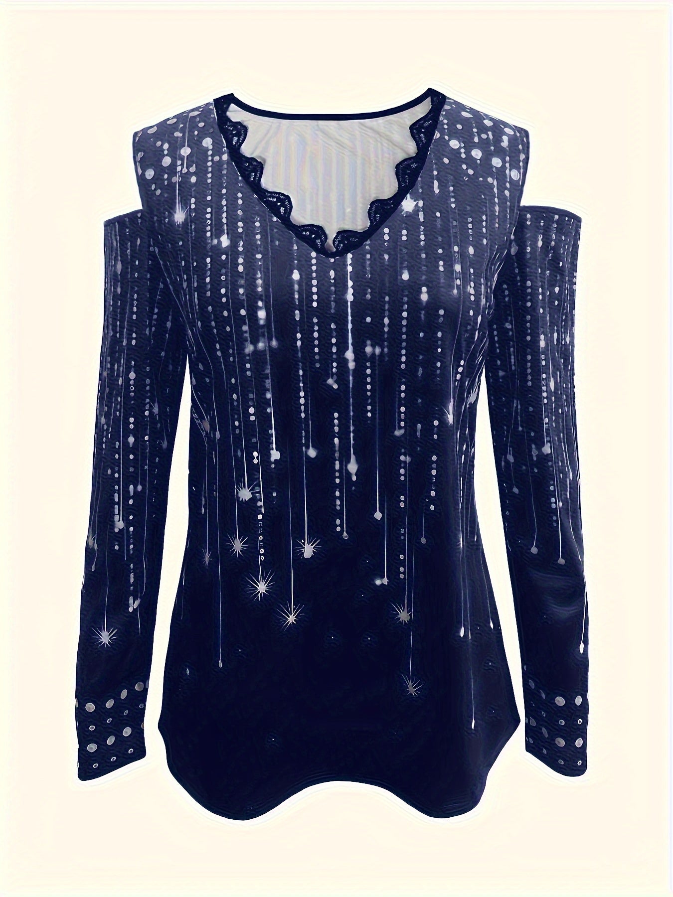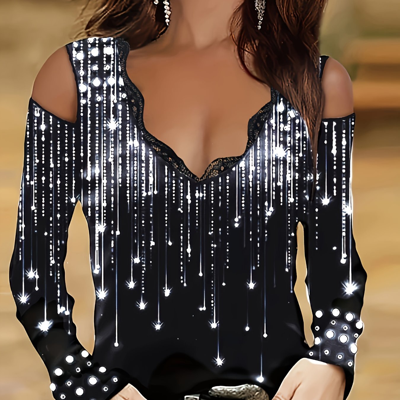 Camiseta com decote em V e acabamento em renda, blusa elegante com ombros descobertos para primavera e outono.