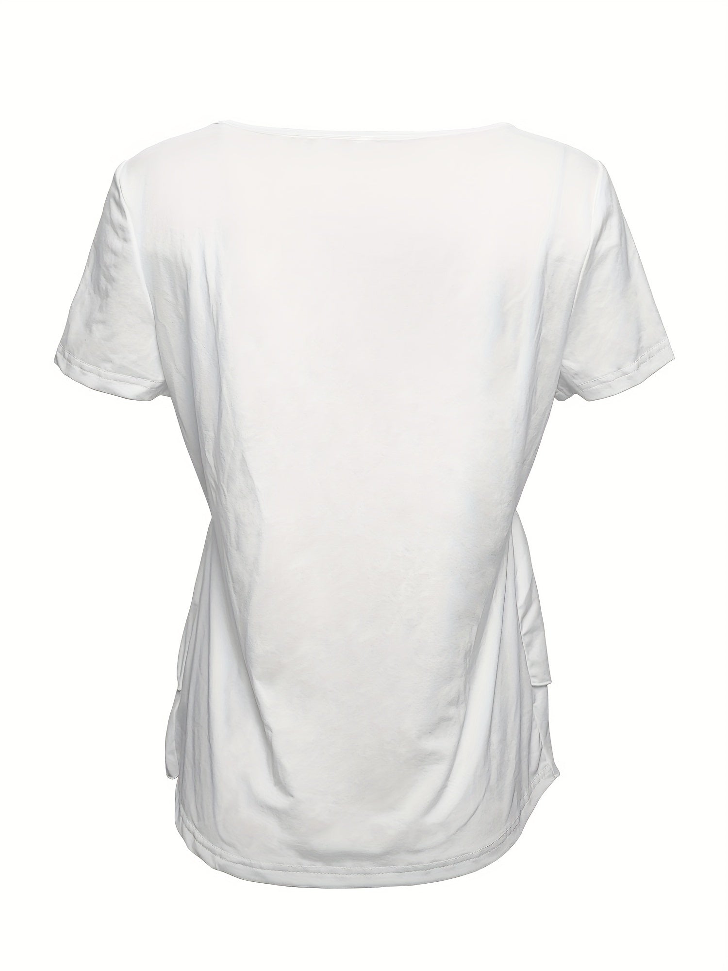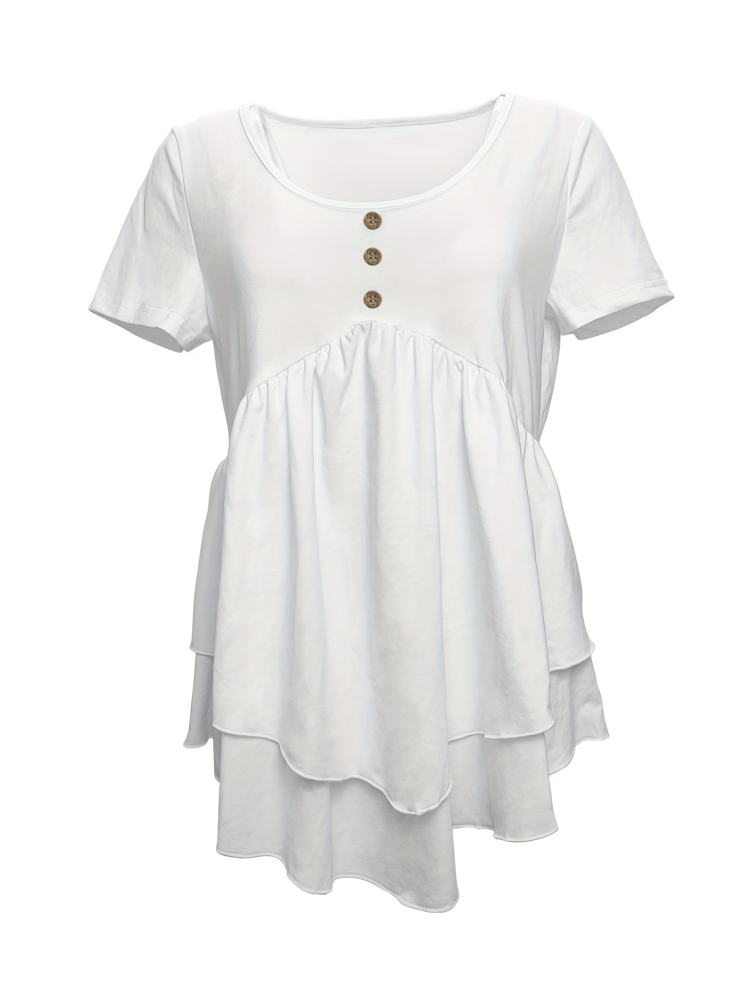 Camiseta de gola redonda de cor sólida, blusa flare com botões na frente e em camadas para primavera/verão.