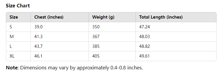 Boa qualidade, bonito e grosso, não muito pesado, tem bolsos fundos, que eram perfeitos para encher minhas mãos do frio. Não era muito pesado. No geral, ótima compra