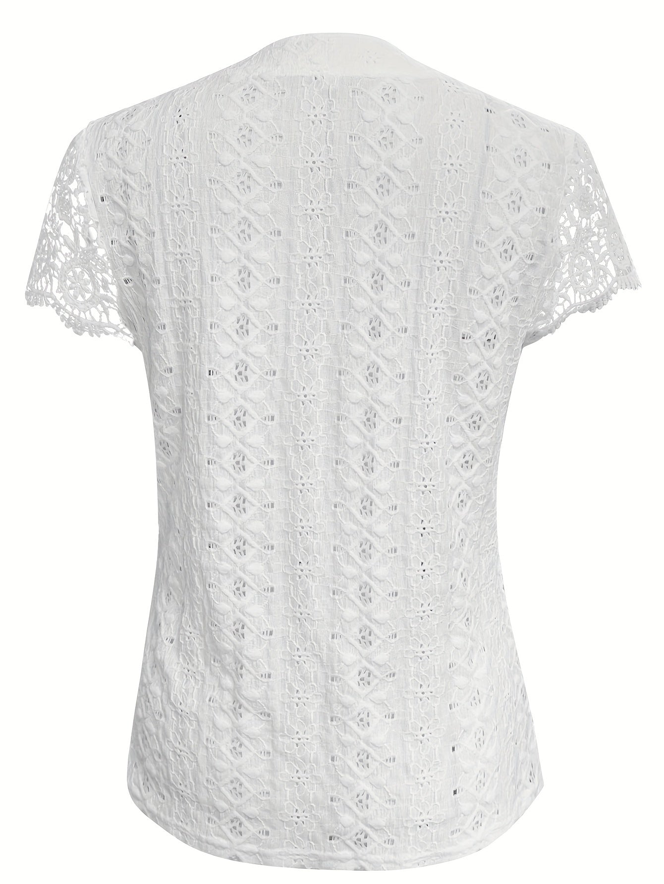 Camiseta feminina com decote em V, renda e detalhes em botões, manga curta, blusa casual de verão.